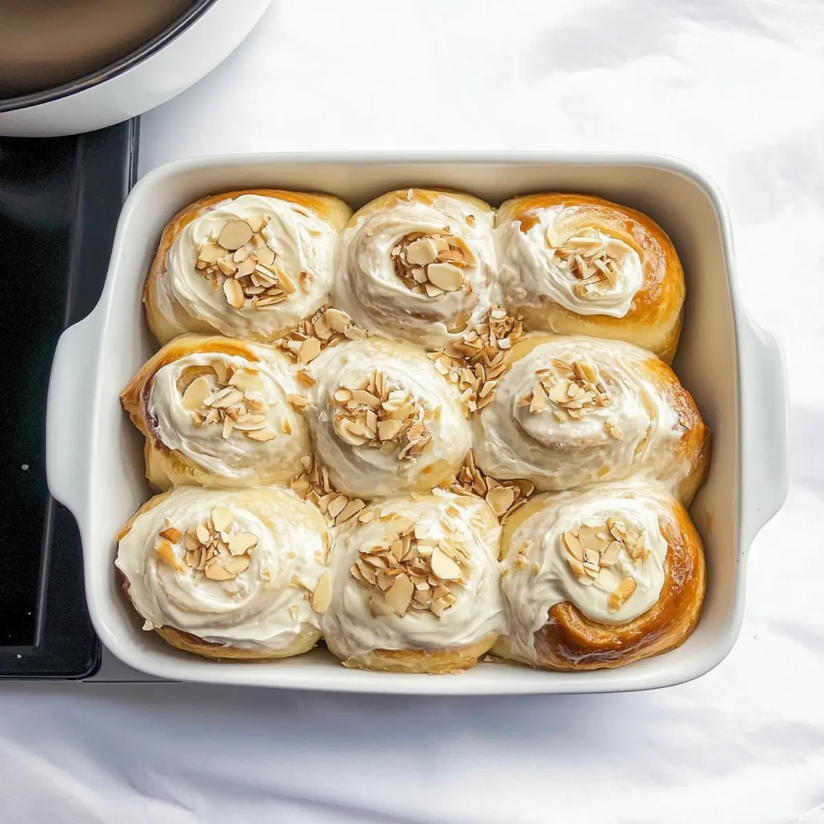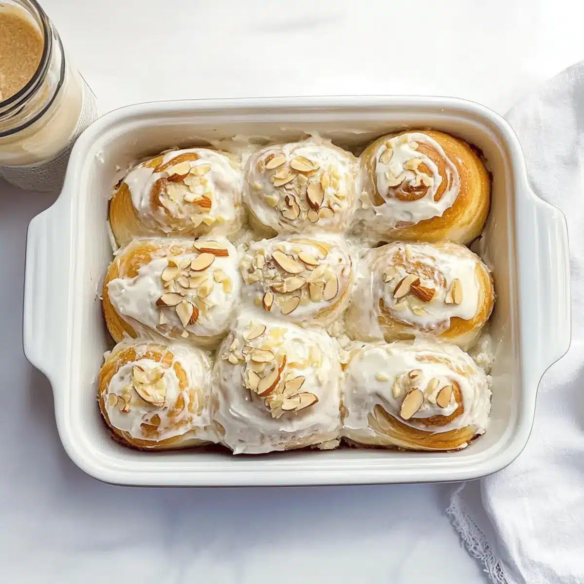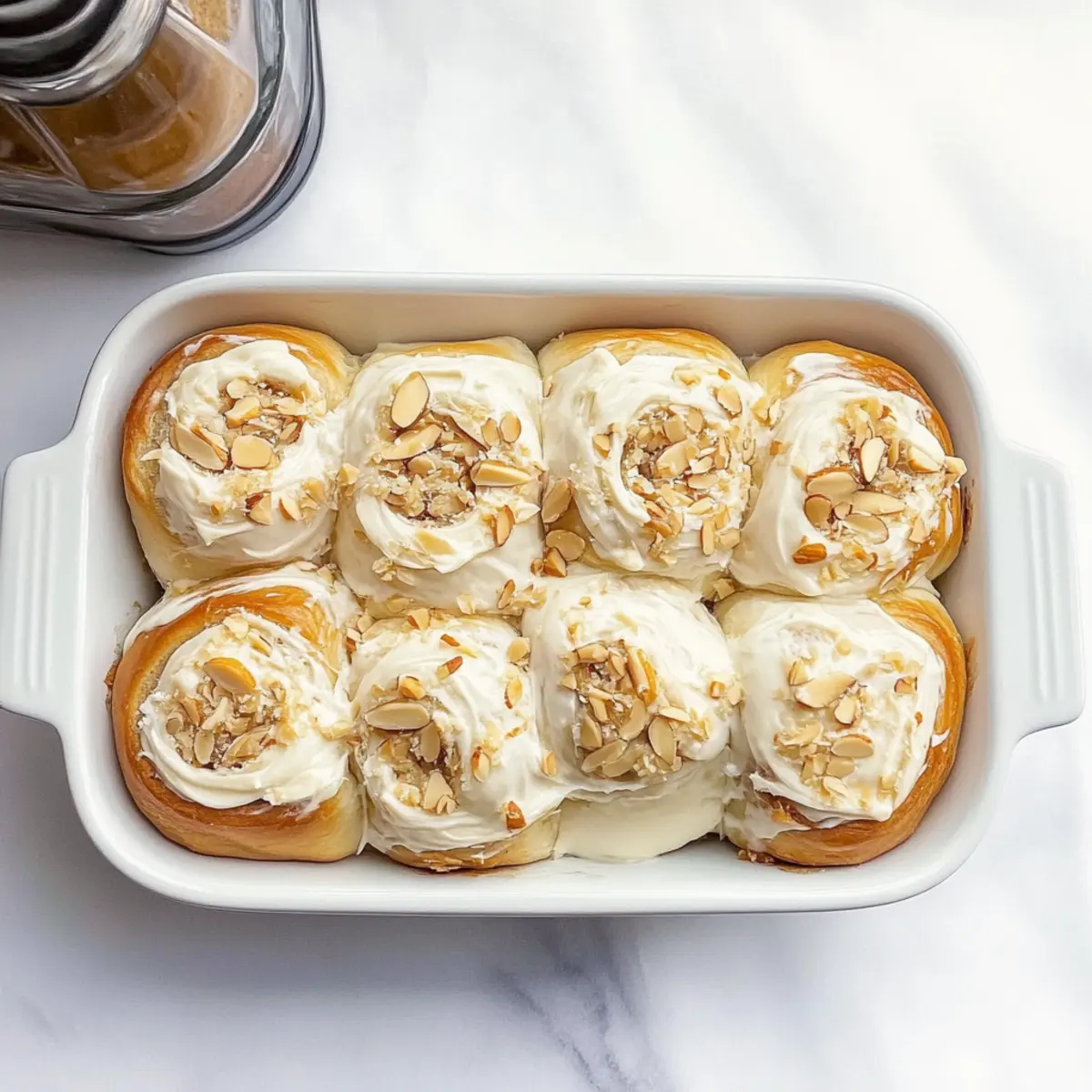 - Once the rolls have cooled slightly, spread the frosting generously over the top and sprinkle slivered almonds while the frosting is still soft.