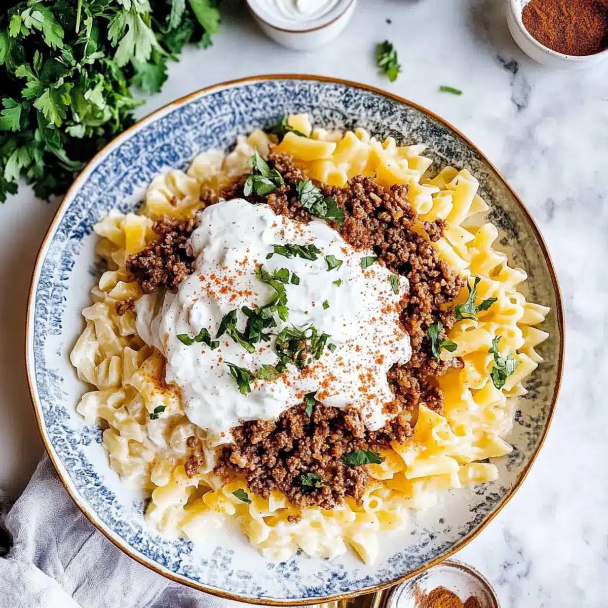 - To serve, layer the components: place the cooked pasta in a large serving dish, spoon the spiced ground beef mixture over the pasta, and drizzle the creamy yogurt sauce on top.