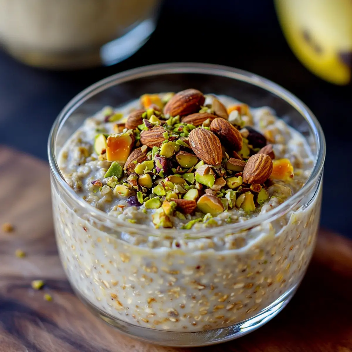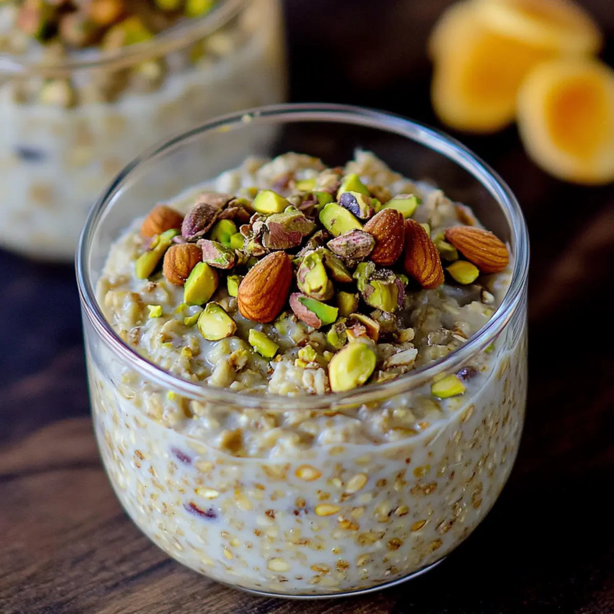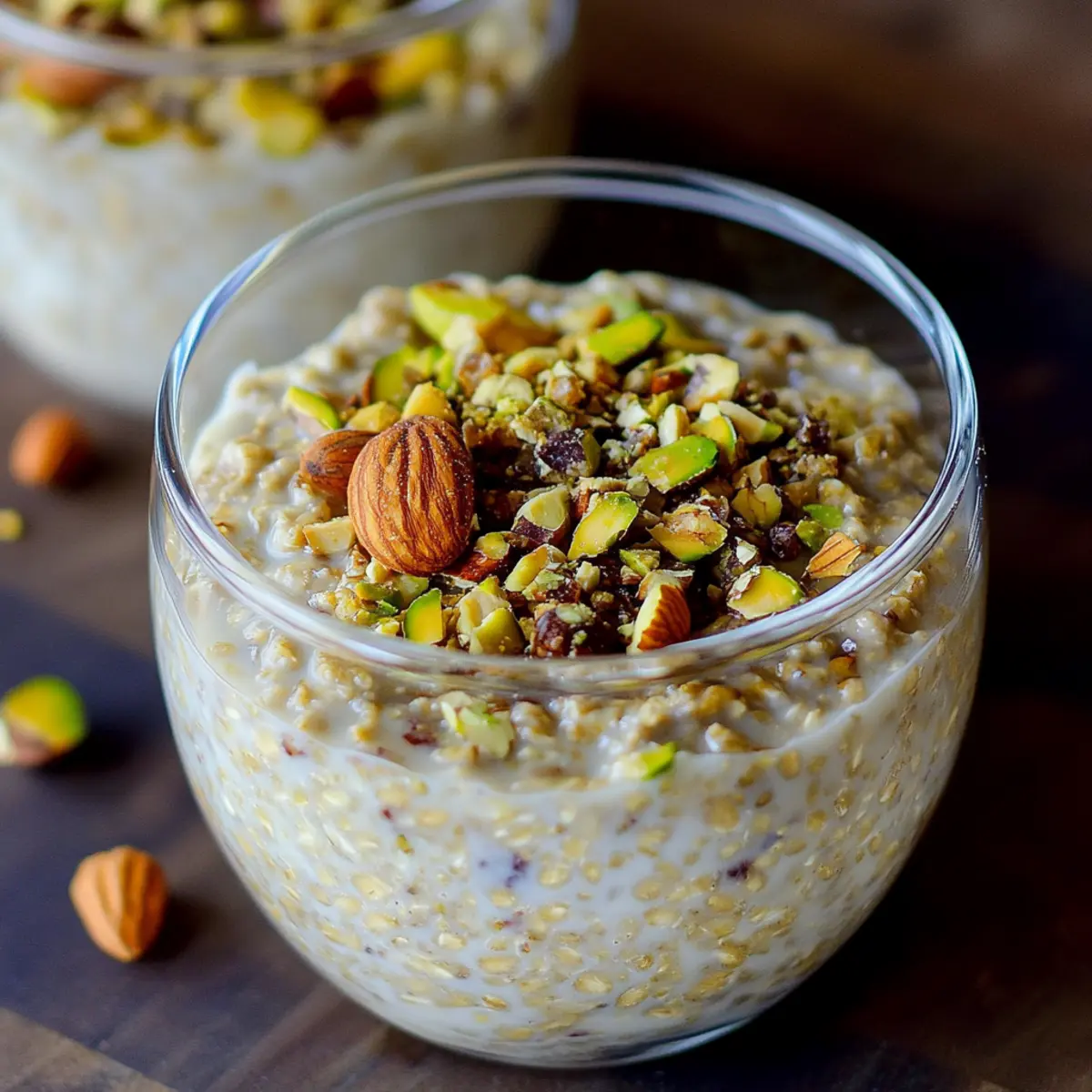 Spoon the oat mixture into individual jars or bowls, layering in the remaining nut topping generously on top. If desired, add your favorite fruits for extra freshness and color. Seal them tightly and store in the refrigerator, where they will keep for up to four days, making them a perfect breakfast option for busy mornings.