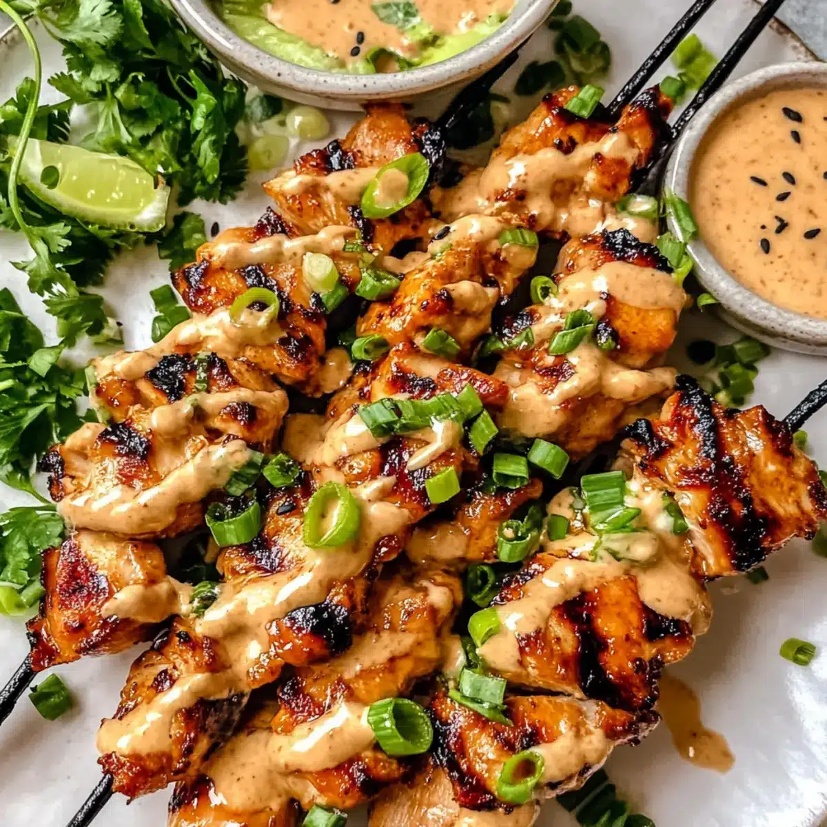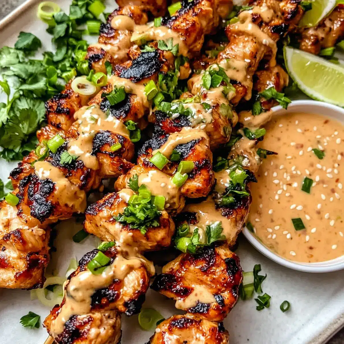 - Remove skewers from heat and brush with reserved sauce. Garnish with chopped green onions, sesame seeds, and fresh cilantro. Serve hot with lime wedges and remaining sauce for dipping.