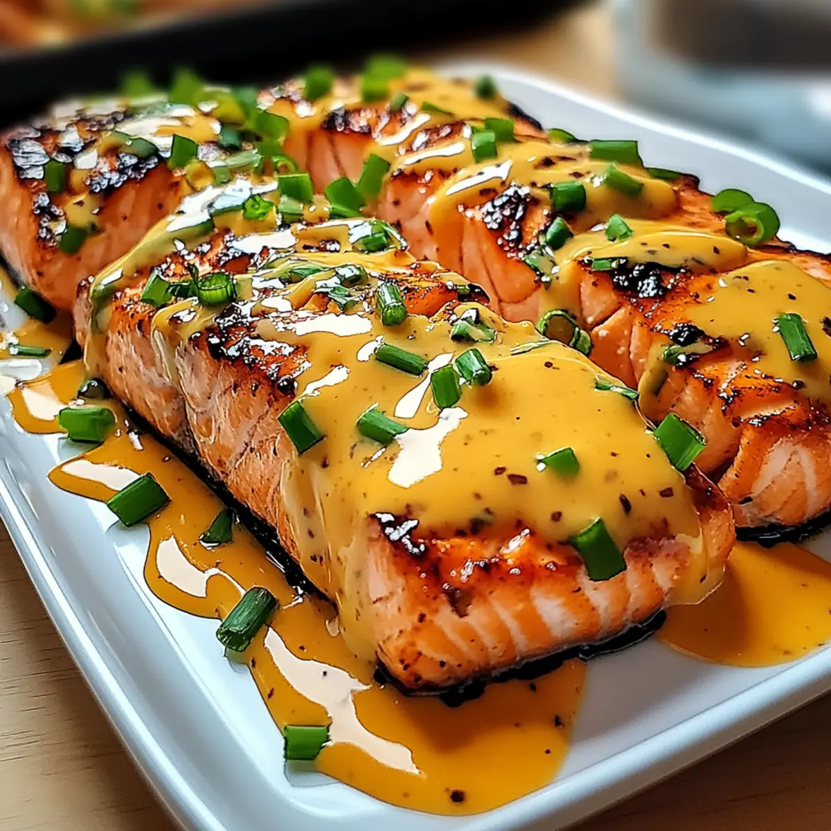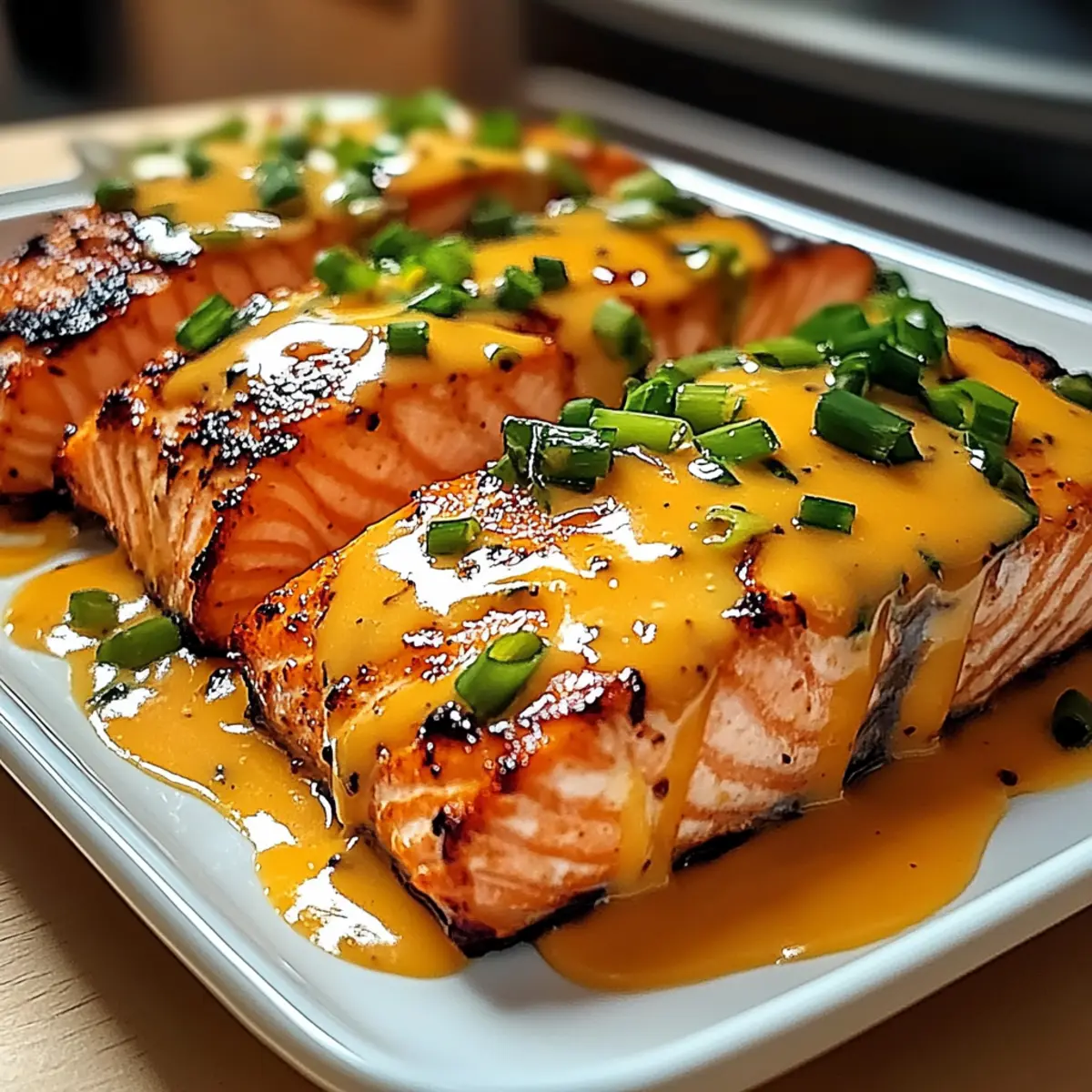 - Once cooked, remove salmon from skillet, let rest for 1 minute, drizzle with sauce and garnish with green onions.