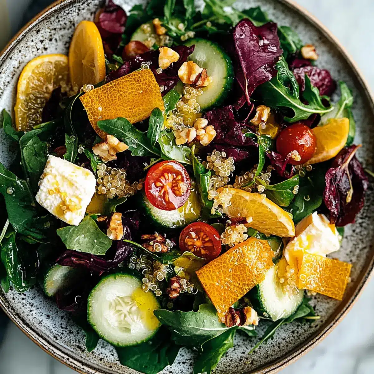 In the large bowl with the chopped greens, add the cooled beetroot cubes, orange segments, and toasted walnuts. If you’re using feta cheese, crumble it over the top for added creaminess. Gently toss everything together, ensuring the vibrant colors blend harmoniously in your Beetroot Orange Walnut Salad.