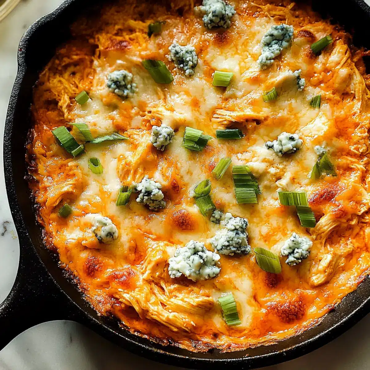Once out of the oven, sprinkle crumbled blue cheese on top (if using) and garnish with freshly sliced green onions or chives. These final touches add flavor and color, making your Buffalo Chicken Dip not only delicious but also visually enticing for serving.