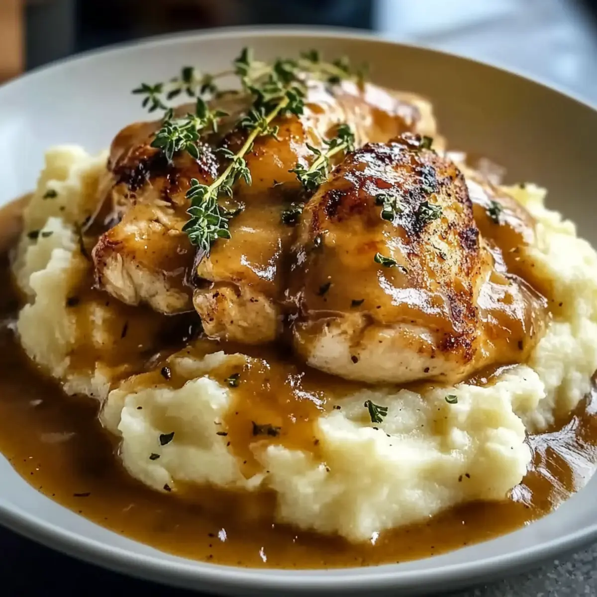 - Serve mashed potatoes topped with chicken and garlic gravy. Garnish with fresh herbs if desired.