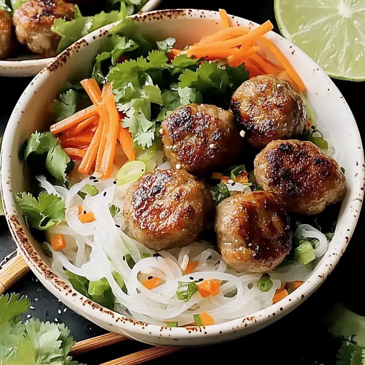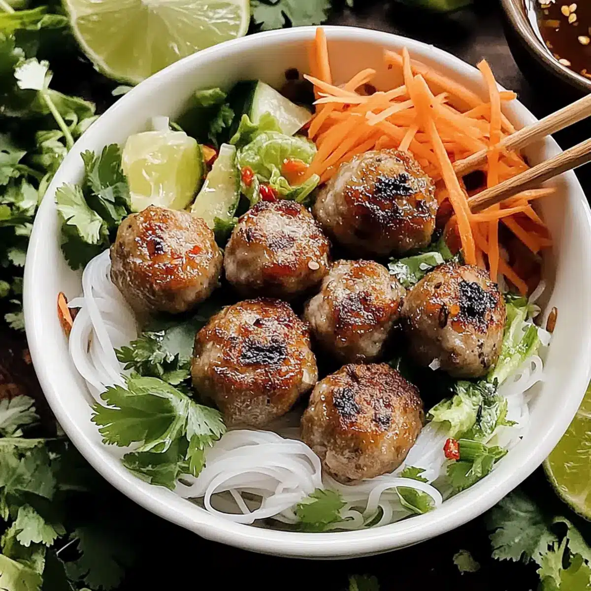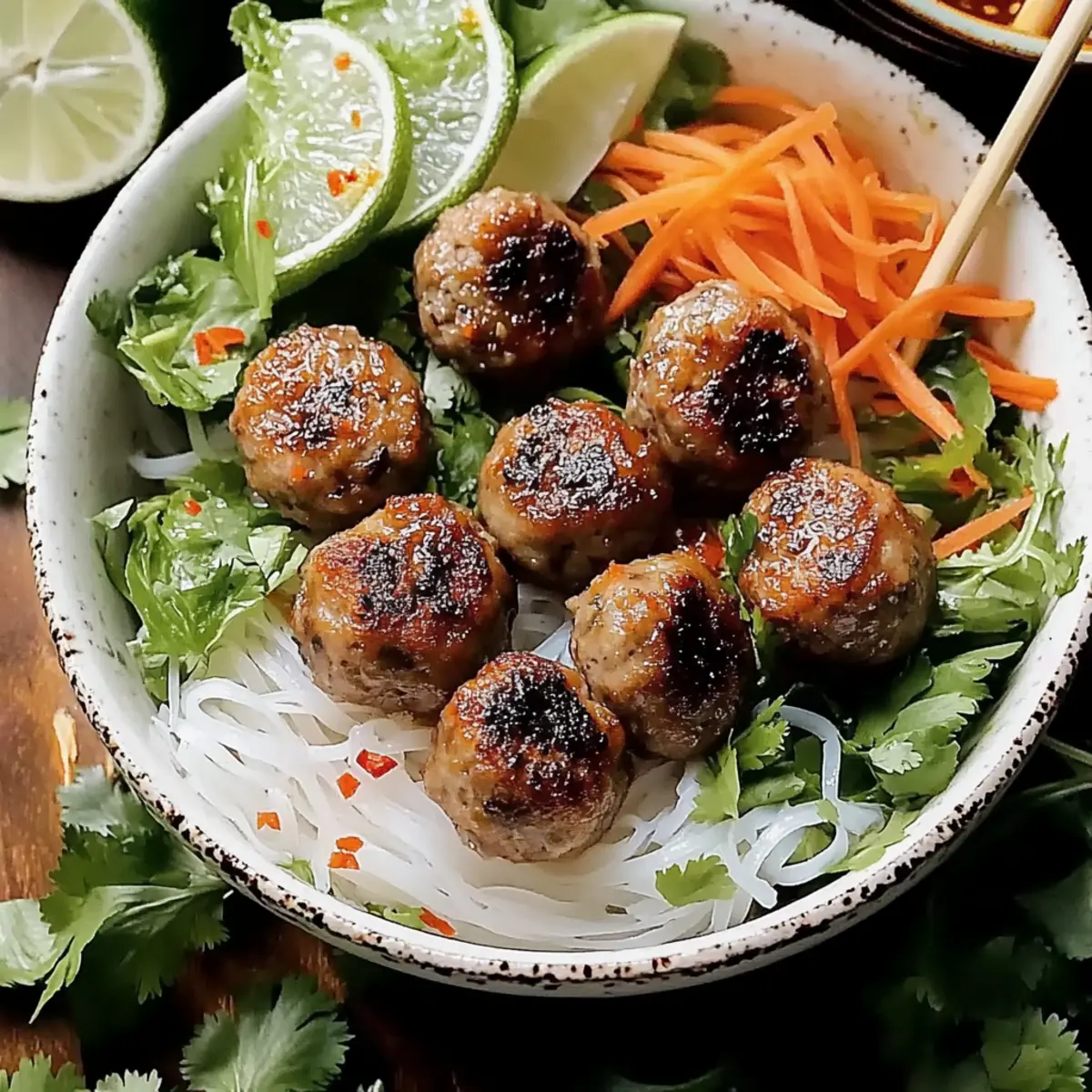 - Assemble Bowls: Divide soaked noodles into bowls, arrange meatballs on top, add fresh vegetables, and drizzle with Nuoc Cham sauce.