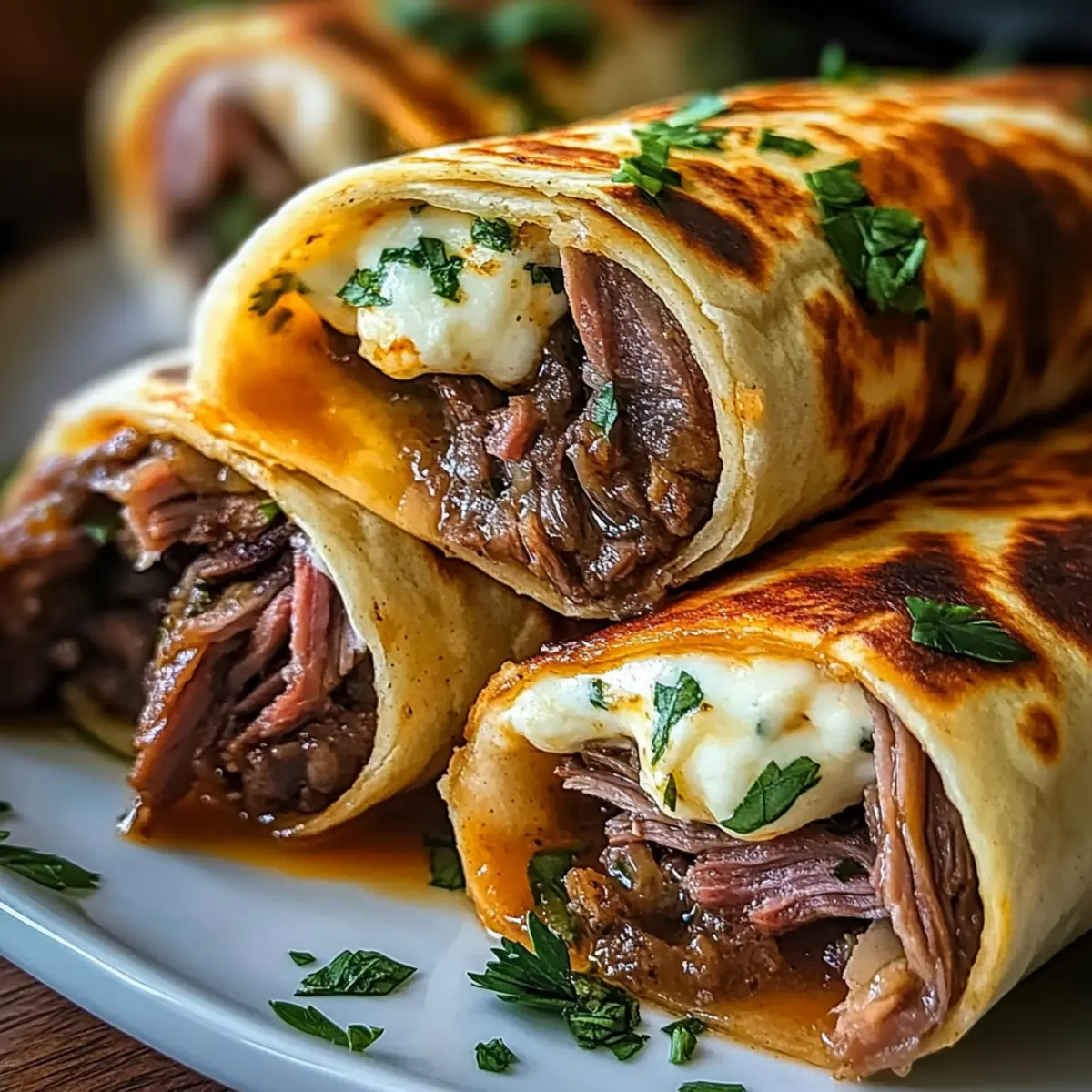 - Lay out the tortillas, layer with warm roast beef and shredded cheese, then roll tightly and place seam-side down on a baking sheet.