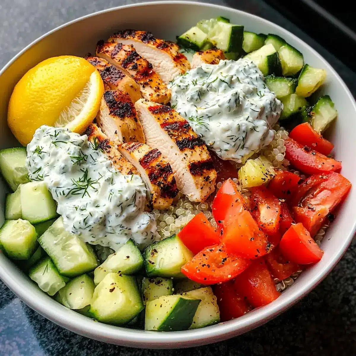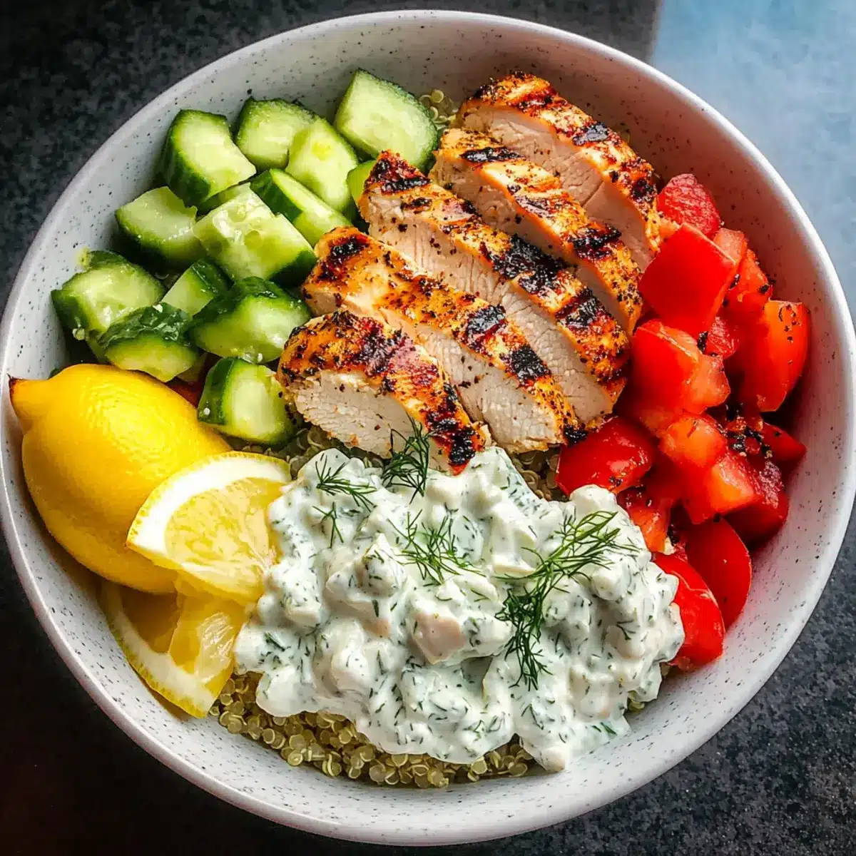 - Assemble the bowls by layering rice or quinoa, sliced chicken, and fresh vegetables, finishing with a dollop of tzatziki and a drizzle of olive oil and lemon juice.