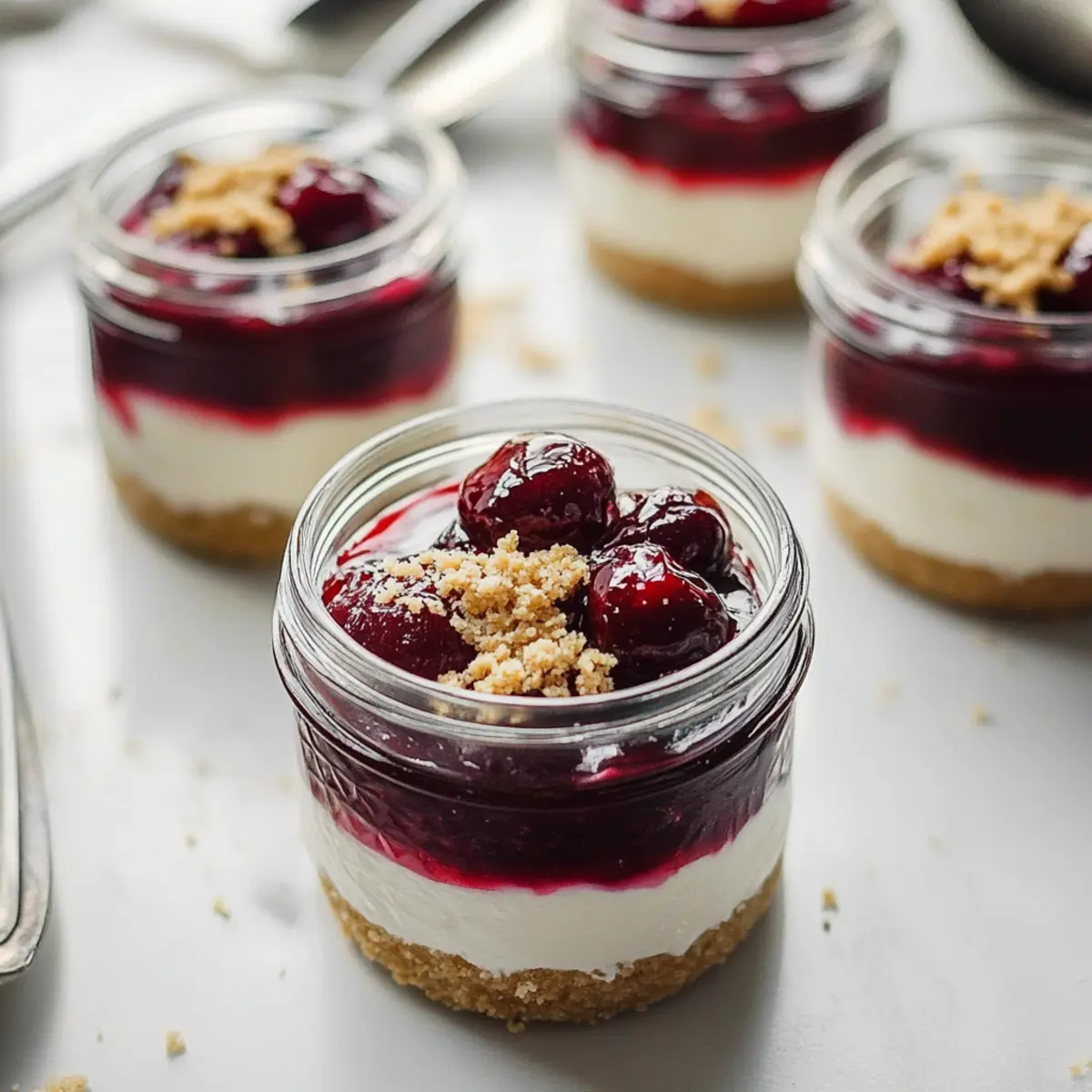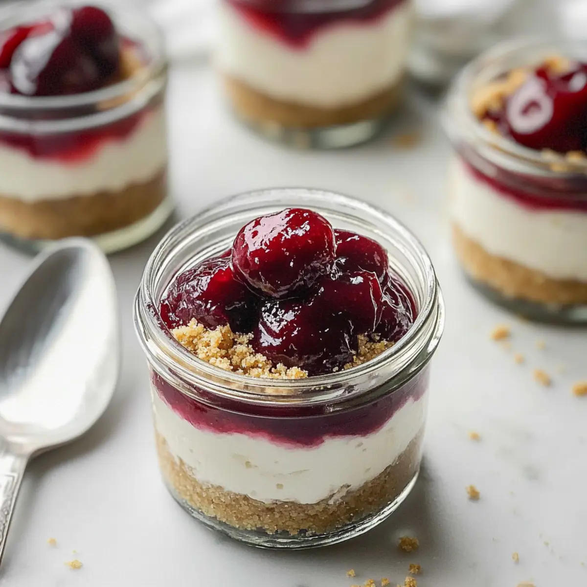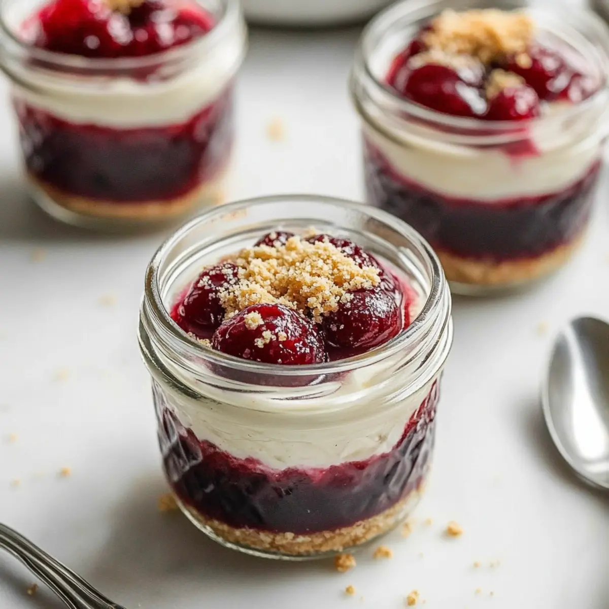 These Healthier No-Bake Cheesecakes in Jars are perfect for busy home cooks looking to streamline their meal prep! You can prepare the cherry topping and cheesecake filling up to 24 hours in advance; simply store the cherry compote and filling separately in airtight containers in the refrigerator to maintain their vibrant flavors and textures. Meanwhile, the graham cracker crust can be prepared and stored at room temperature for up to 3 days—just make sure it’s kept in an airtight container to prevent it from getting soggy. When you’re ready to serve, layer your prepped components in jars, and top with the cherry compote for a refreshing dessert that’s just as delicious as when freshly made!