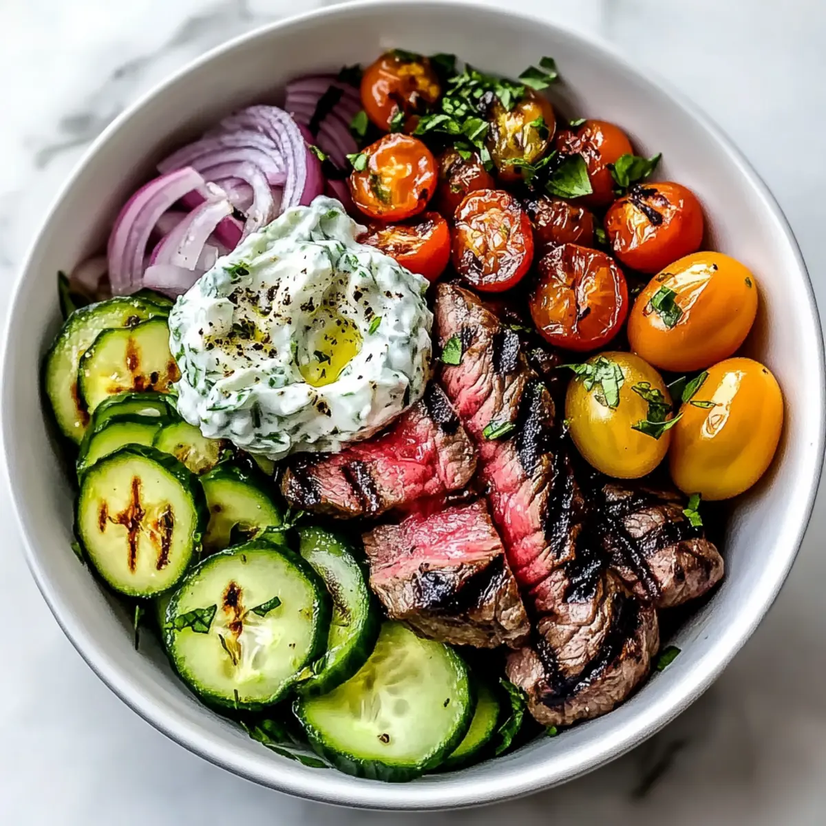 Now it’s time to create your Mediterranean Steak Bowl! In your serving bowl, layer your choice of cooked grains—like brown rice, quinoa, or cauliflower rice—as the base. Follow with the sliced steak, then add colorful toppings such as cherry tomatoes, cucumber, red onion, Kalamata olives, and feta cheese. Drizzle with the zesty vinaigrette and finish with a generous dollop of the tzatziki sauce for a delightful burst of flavor.