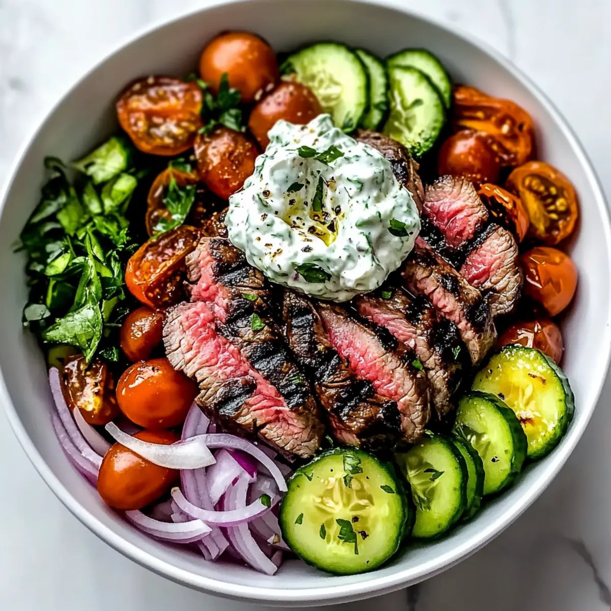 While the steak marinates, prepare the creamy tzatziki sauce. In a mixing bowl, combine Greek yogurt, grated cucumber (squeezed to remove excess moisture), minced garlic, chopped fresh herbs, lemon juice, salt, and pepper. Stir well to blend the flavors, cover, and chill in the refrigerator until ready to use, allowing the ingredients to mingle and create a refreshing topping for your bowl.