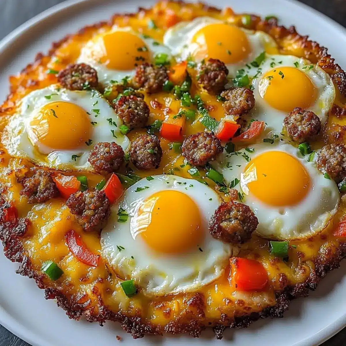 Return the assembled breakfast pizza to the oven and bake for an additional 10 to 12 minutes. Watch as the egg whites firm up and the yolks cook to your desired doneness, creating a delicious centerpiece for your pizza hash brown crust.