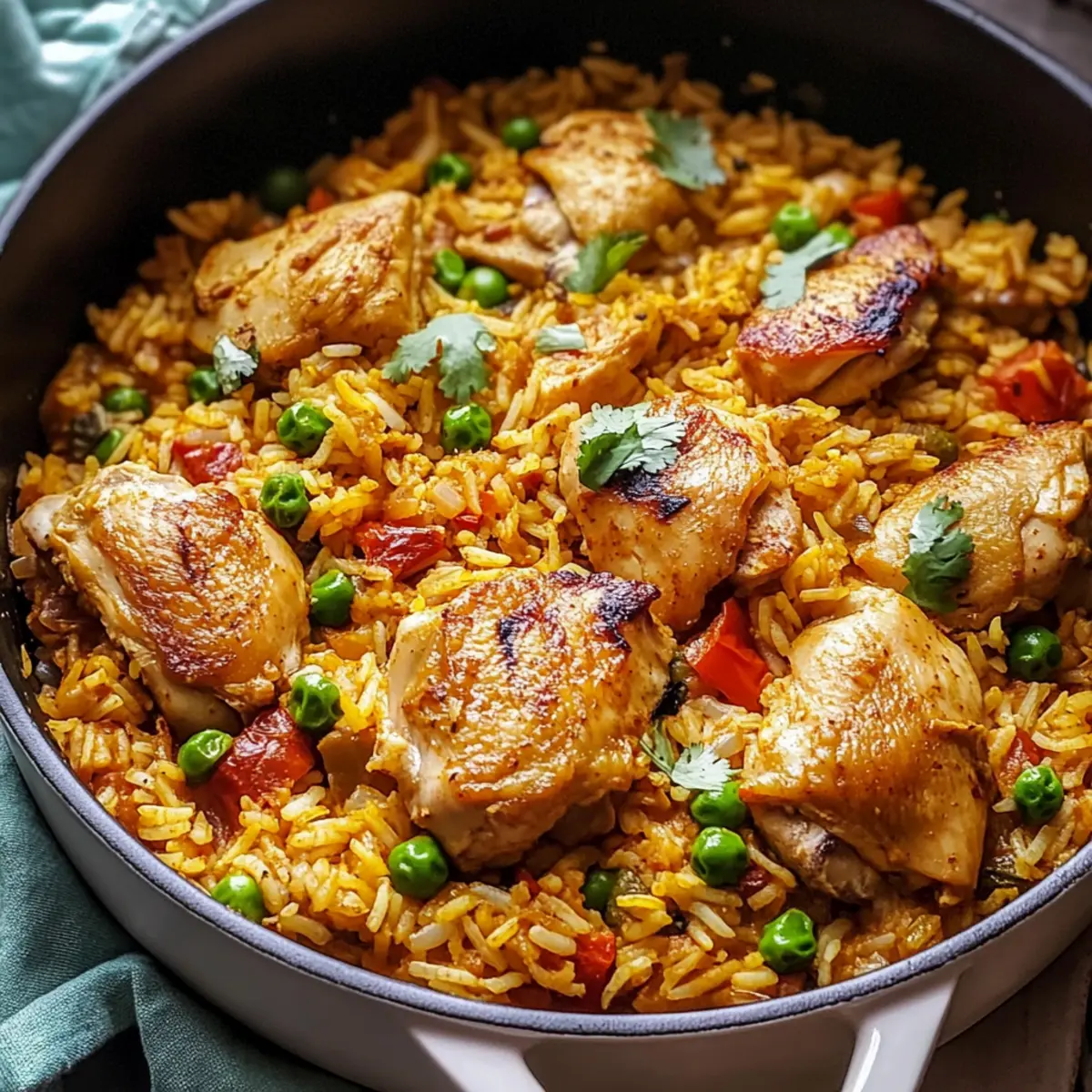 Add the basmati rice to the pot, stirring well to coat the grains in the aromatic oil. Pour in the chicken stock or broth, followed by the turmeric and frozen peas, mixing everything thoroughly. Place the seared chicken thighs on top of the rice mixture, ensuring they’re nestled in for optimal flavor infusion.