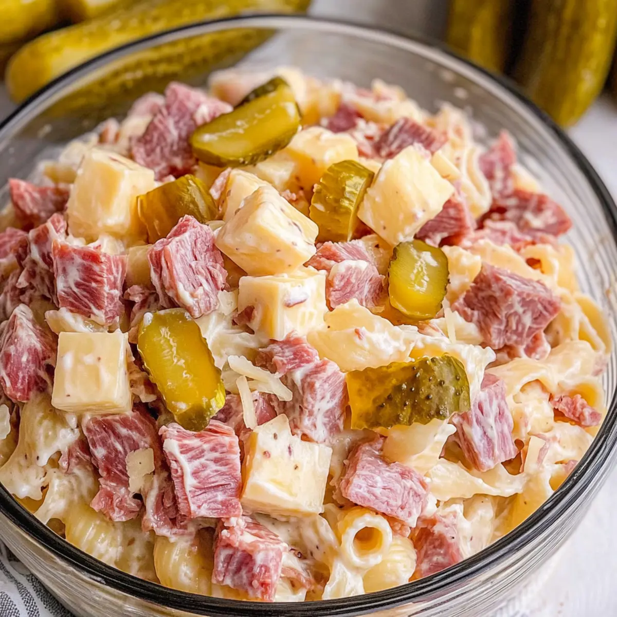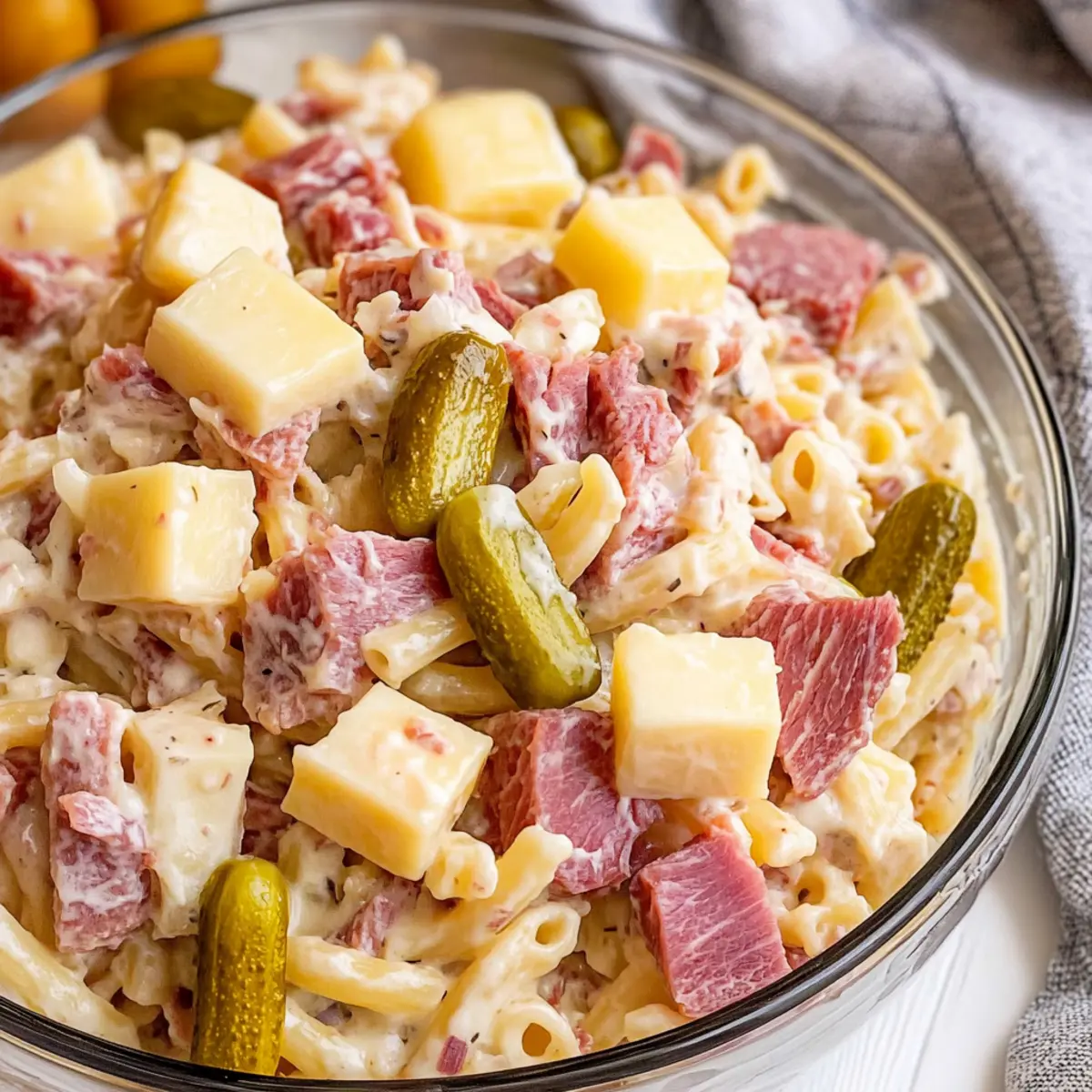 Feel free to experiment with flavors! Adding chopped green onions or fresh herbs like dill can bring in an extra layer of freshness. You might also swap out corned beef for smoked turkey for a lighter twist. The more the merrier when it comes to personalizing your Reuben Pasta Salad!