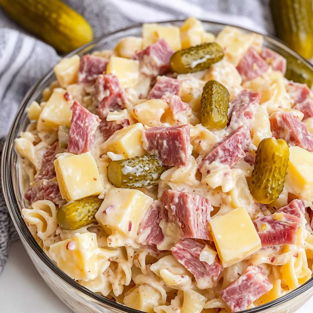 Quality Ingredients: Use thick-sliced deli corned beef and fresh ingredients for the richest flavor in your Reuben Pasta Salad.
