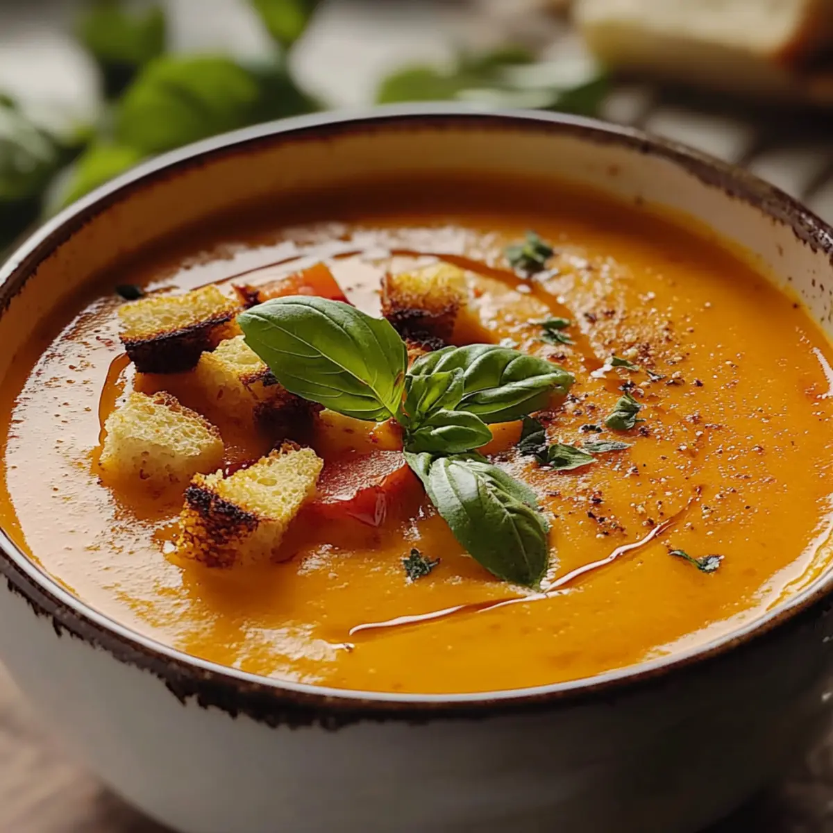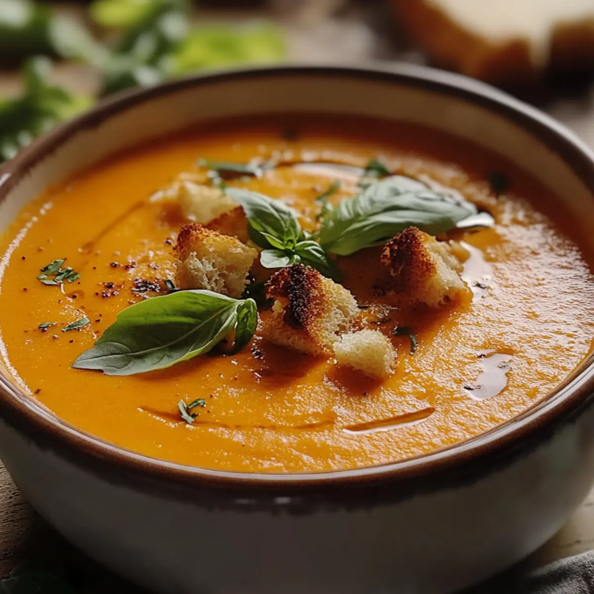 - Ladle the soup into bowls, garnish with fresh basil, homemade croutons, and a drizzle of olive oil.