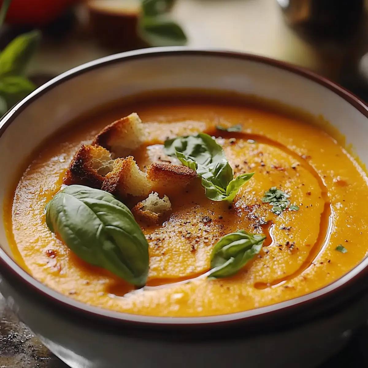 Ladle your creamy soup into warm bowls. Garnish with fresh basil, homemade croutons, and a drizzle of olive oil for a touch of elegance. The inviting aroma combined with the appealing presentation will be sure to impress your family and friends—this is comfort food at its finest!