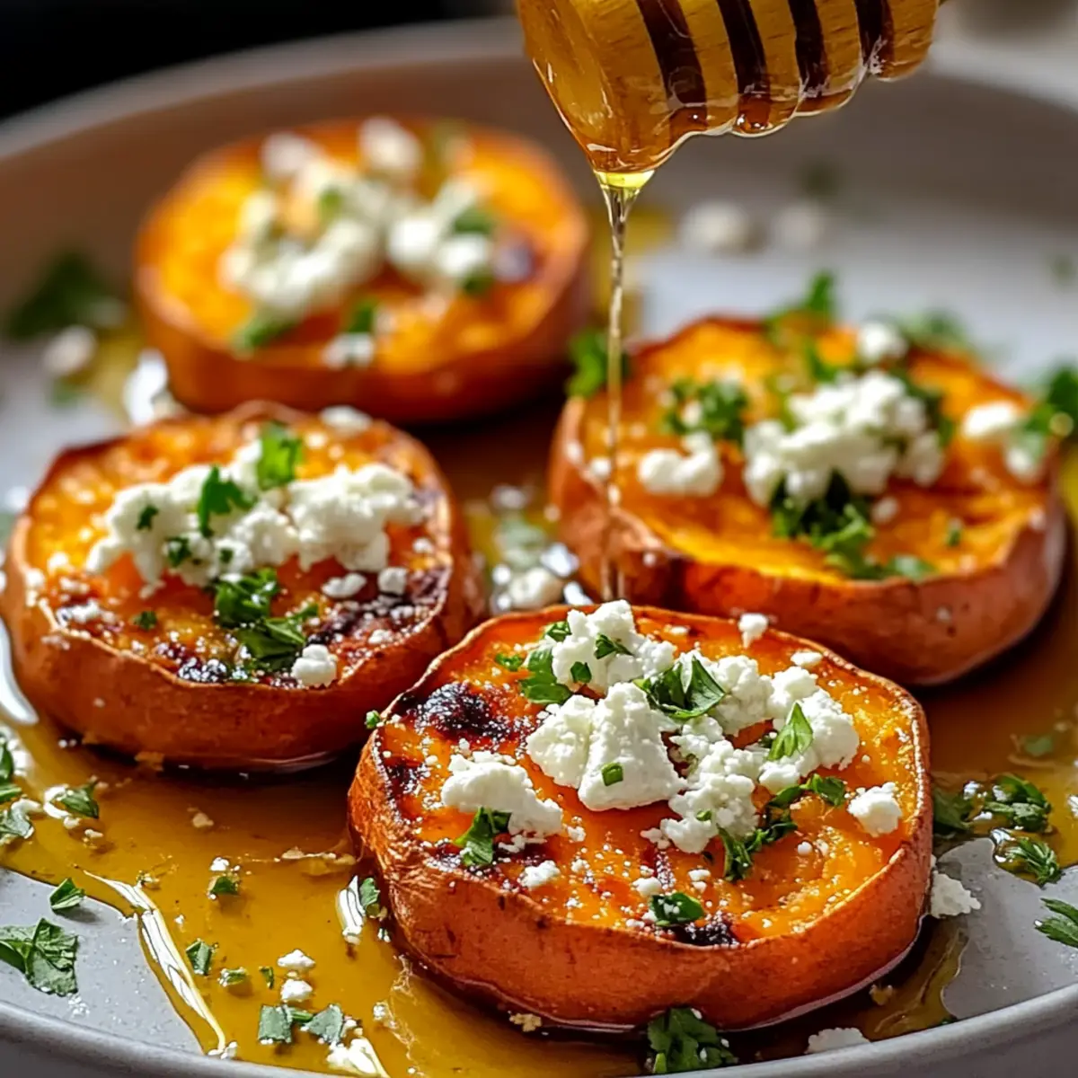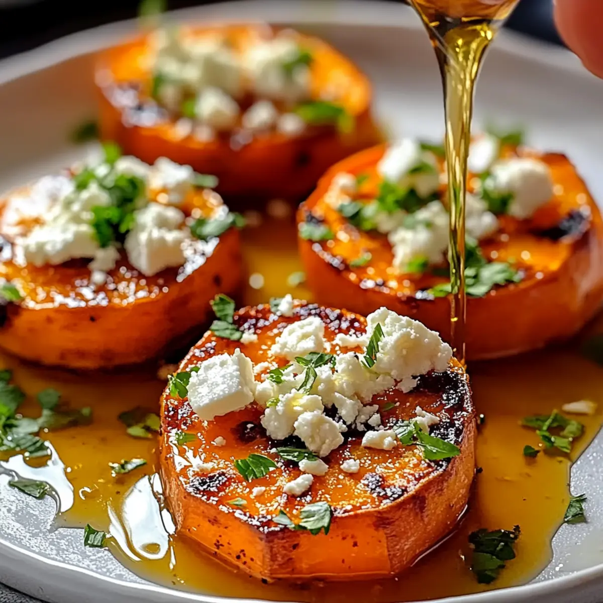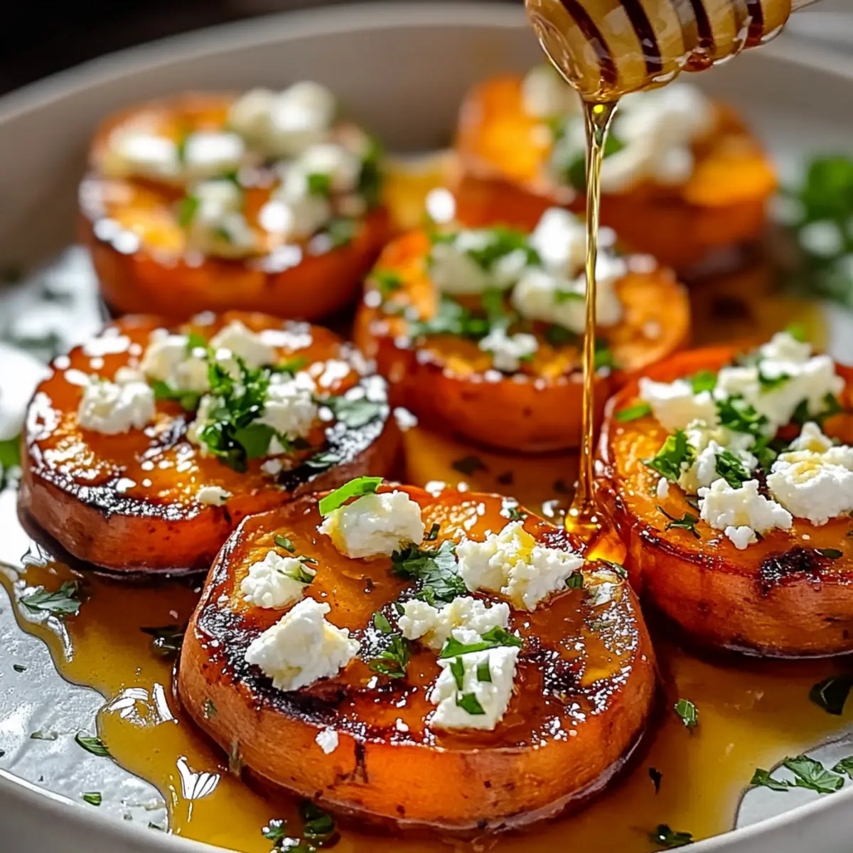 Roasted Sweet Potato Rounds Drizzled with Honey & Feta Bliss