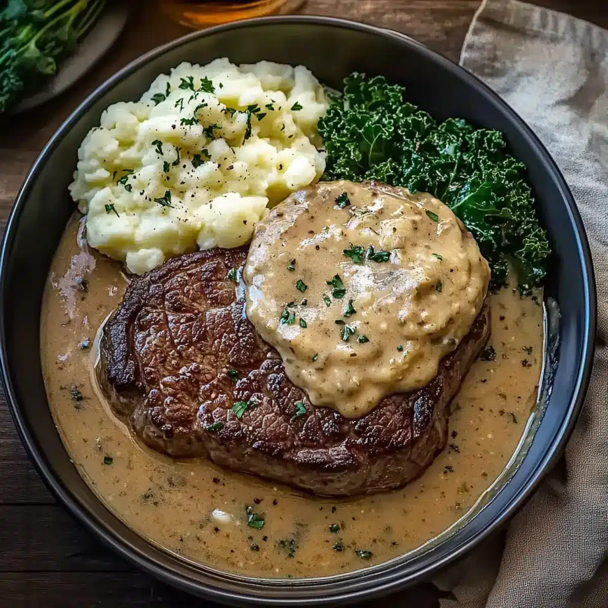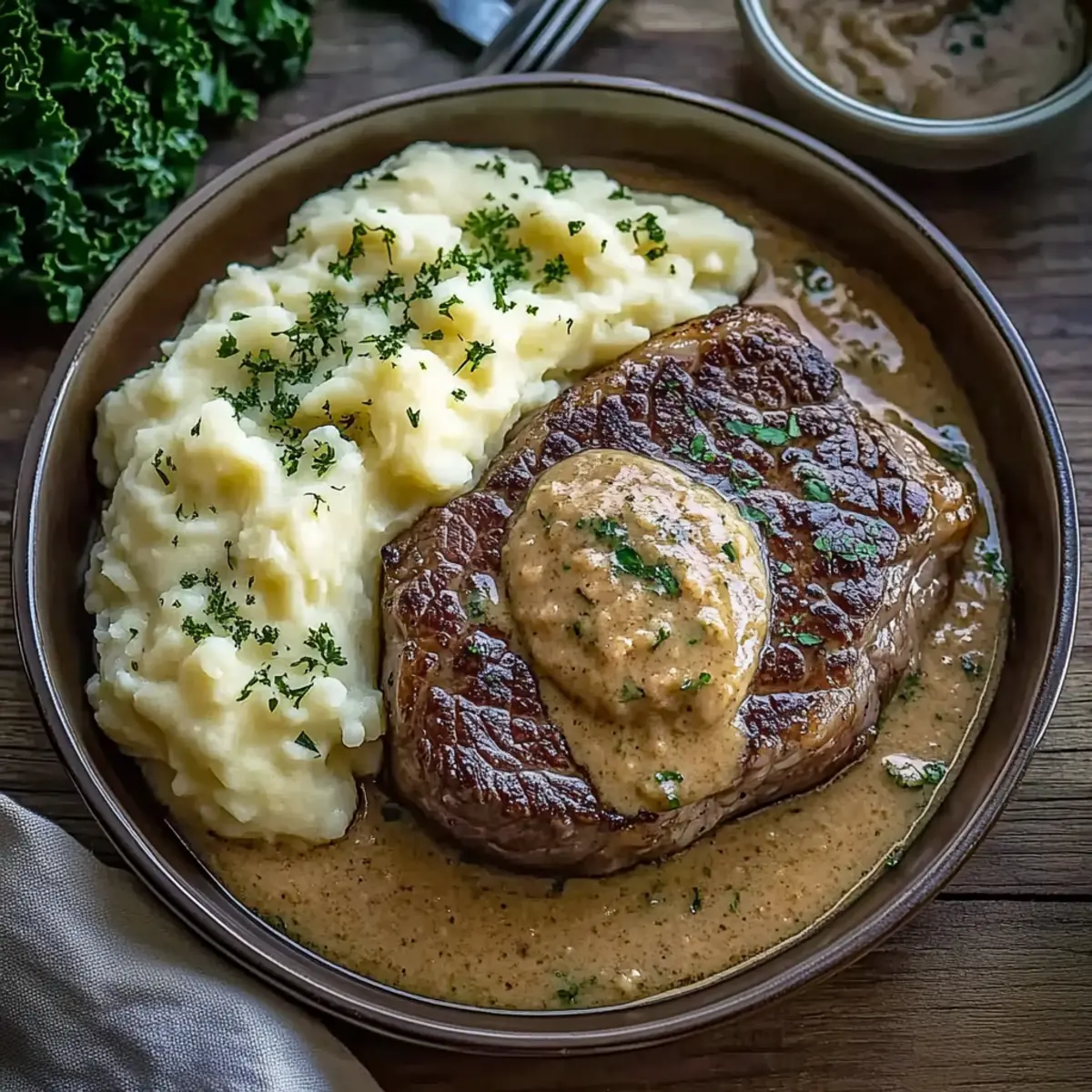 Creamy Mashed Potatoes: Fluffy and buttery, these mashed potatoes serve as a comforting base that balances the rich flavors of the steak.