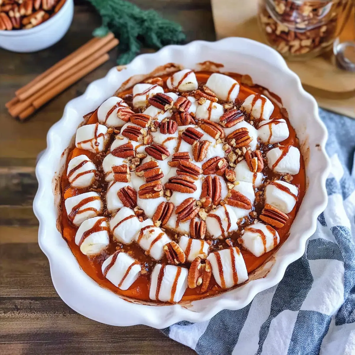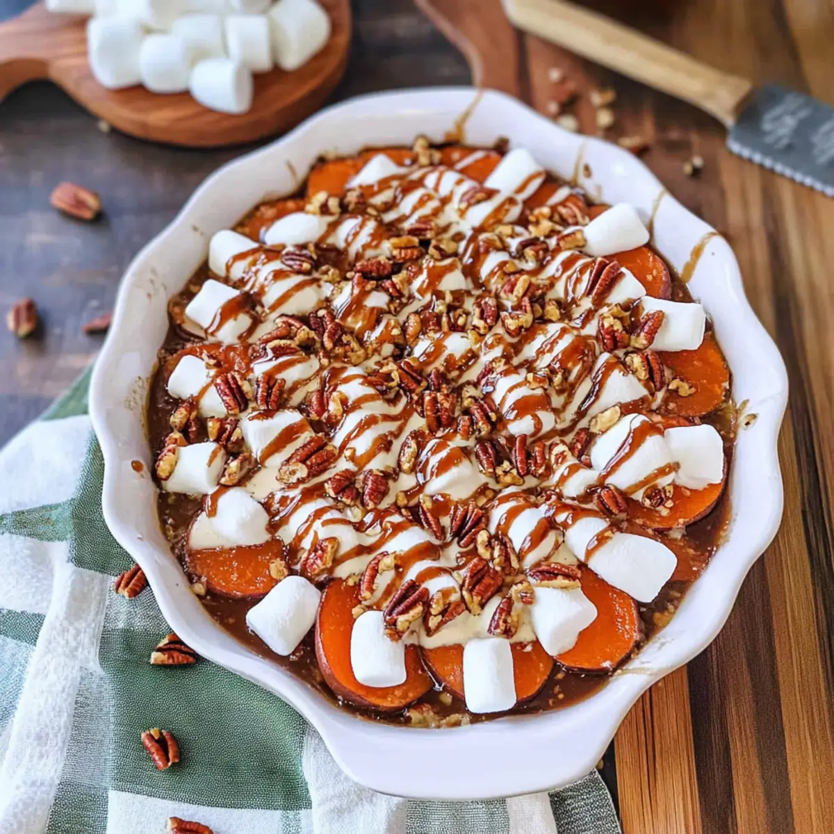 - Remove foil, drizzle remaining sauce, and sprinkle pecans and marshmallows.