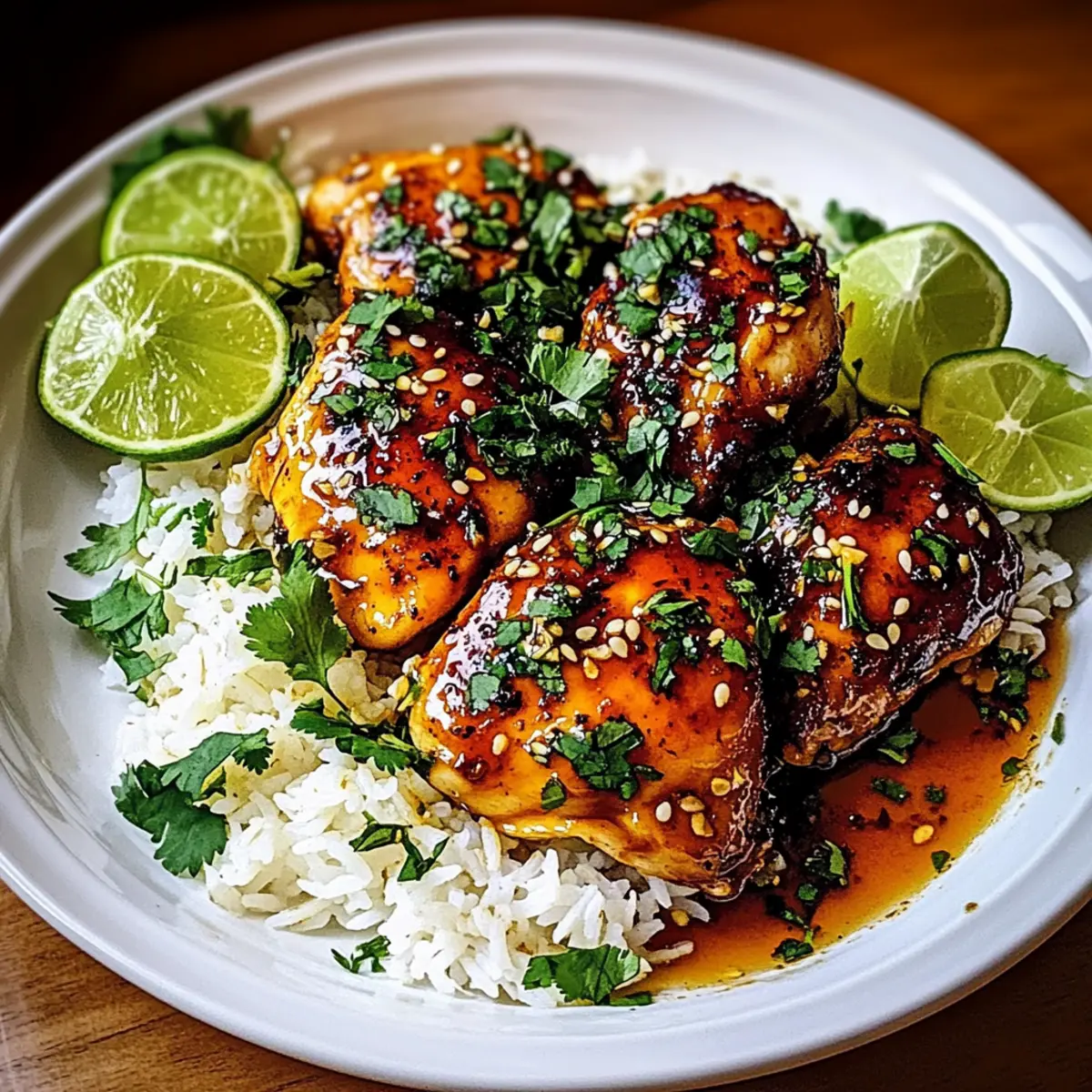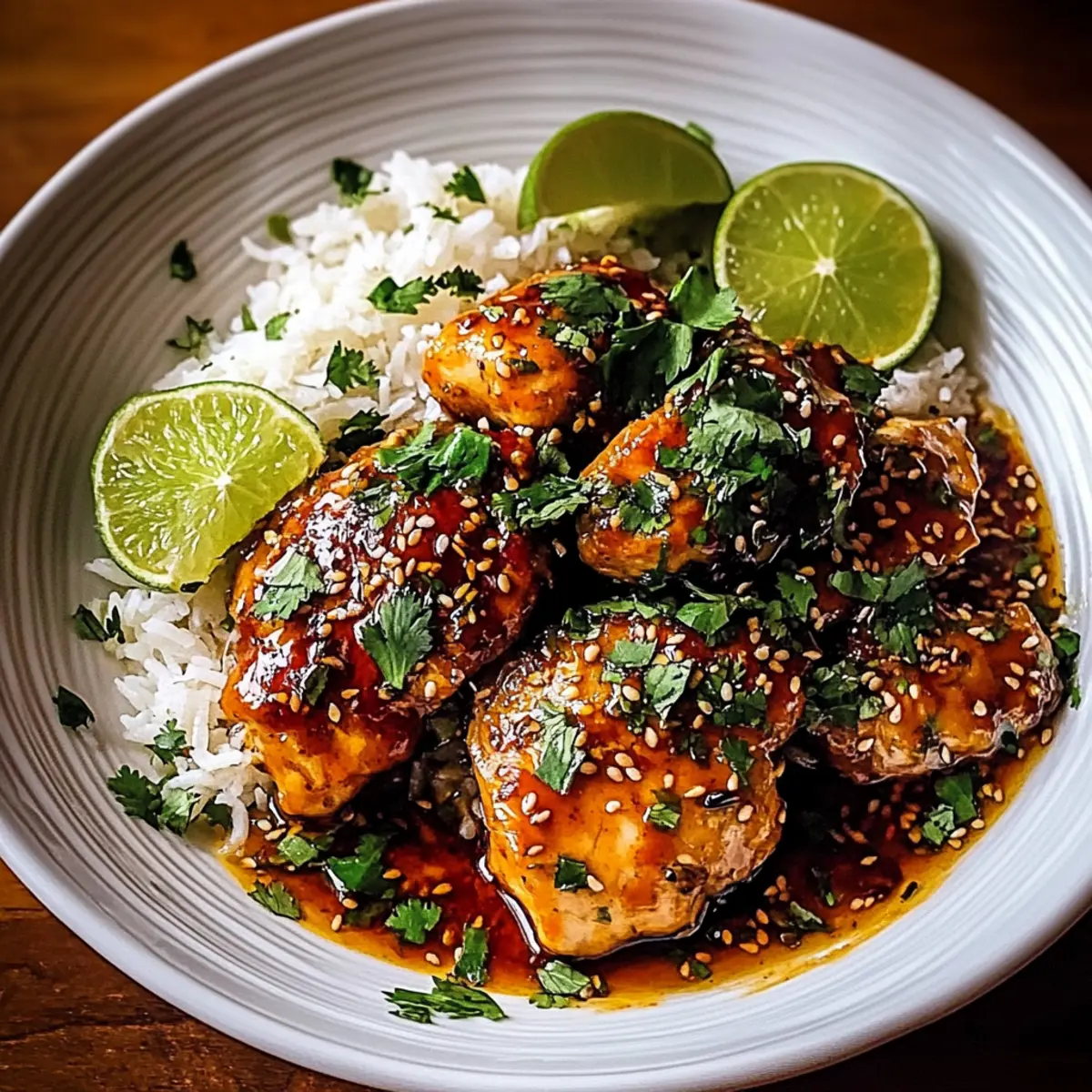 Fluff the coconut rice with a fork and serve it alongside your beautifully glazed chicken. Garnish with freshly chopped cilantro and lime wedges for a burst of color and freshness. The contrast of creamy rice and spicy chicken makes for a delightful meal that everyone will enjoy.