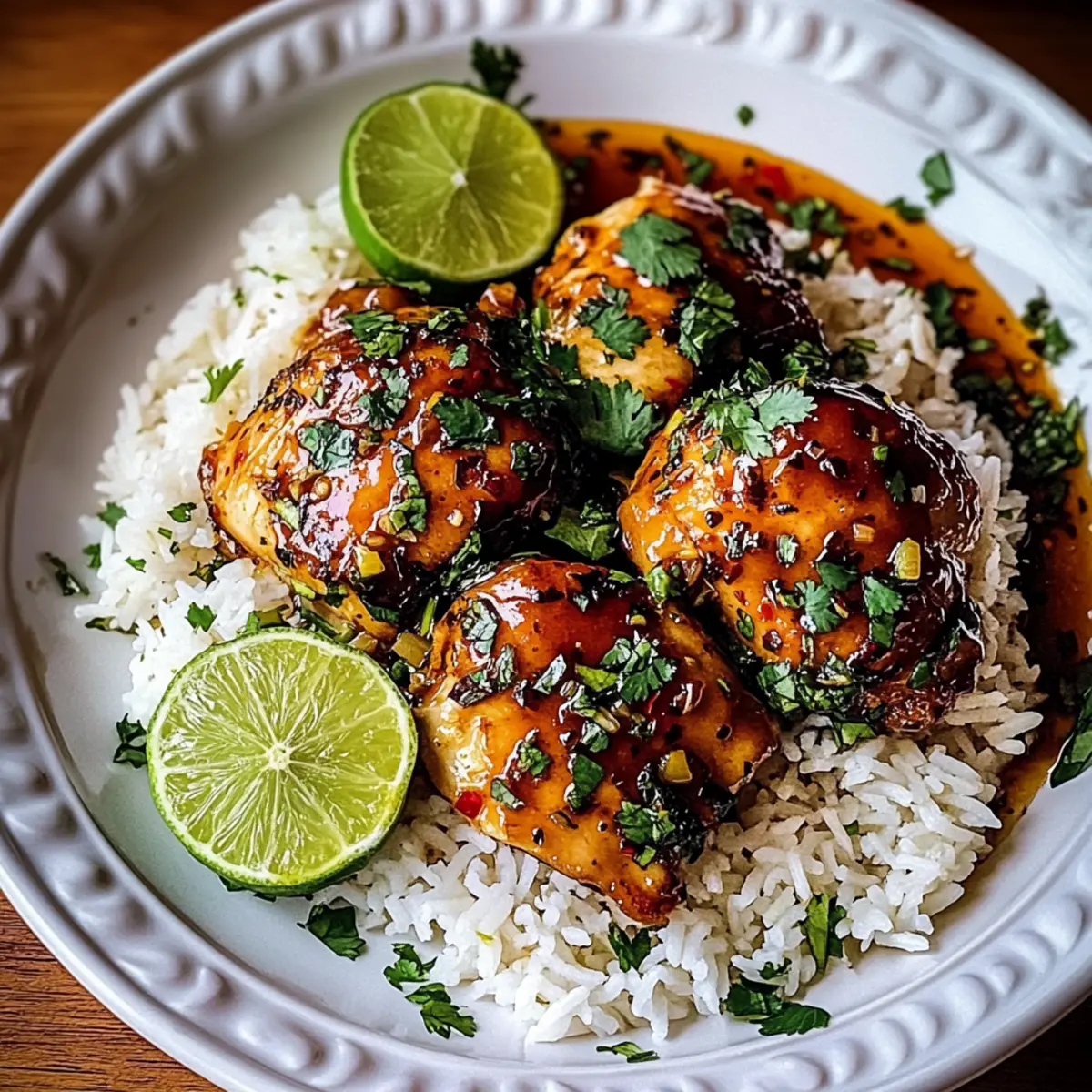 - Fluff the coconut rice and serve alongside the chicken, garnished with cilantro and lime wedges.