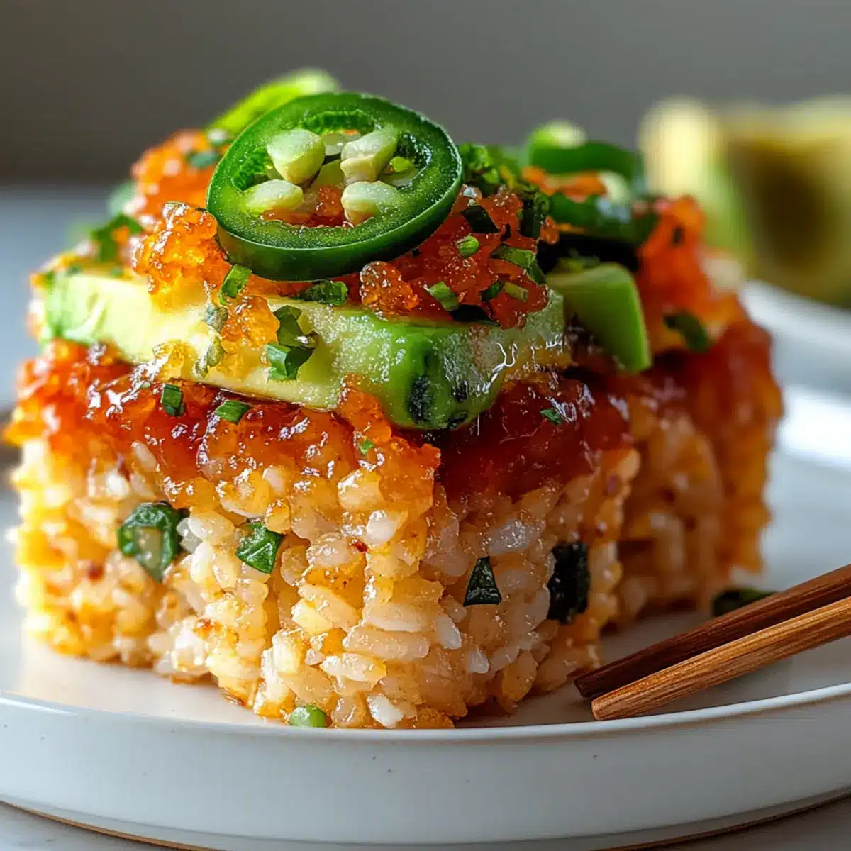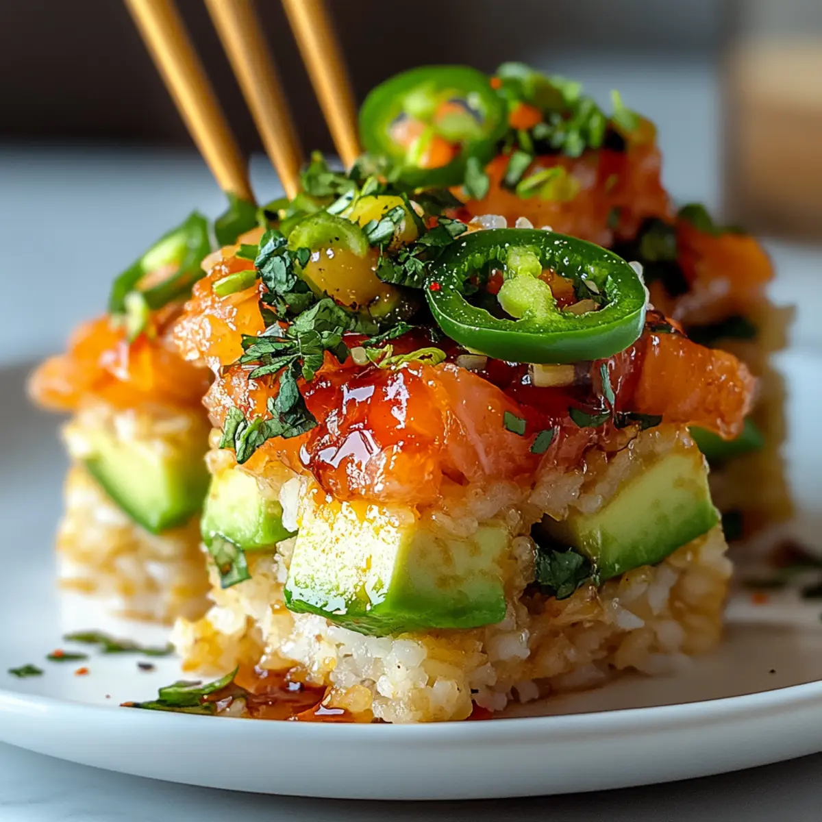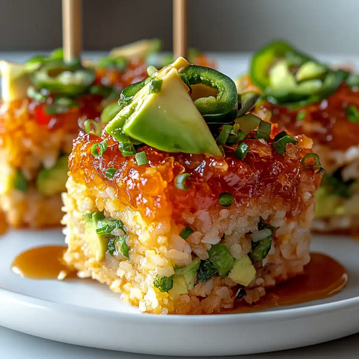 Absolutely! This Spicy Salmon Crispy Rice recipe can be adapted for dietary preferences. For a vegetarian or vegan version, substitute sashimi-grade salmon with diced firm tofu or marinated watermelon. Use a vegan mayo alternative for the topping to maintain that creamy richness without using animal products. Always check for any allergies concerning the ingredients, particularly for those who may be allergic to fish or sesame seeds.