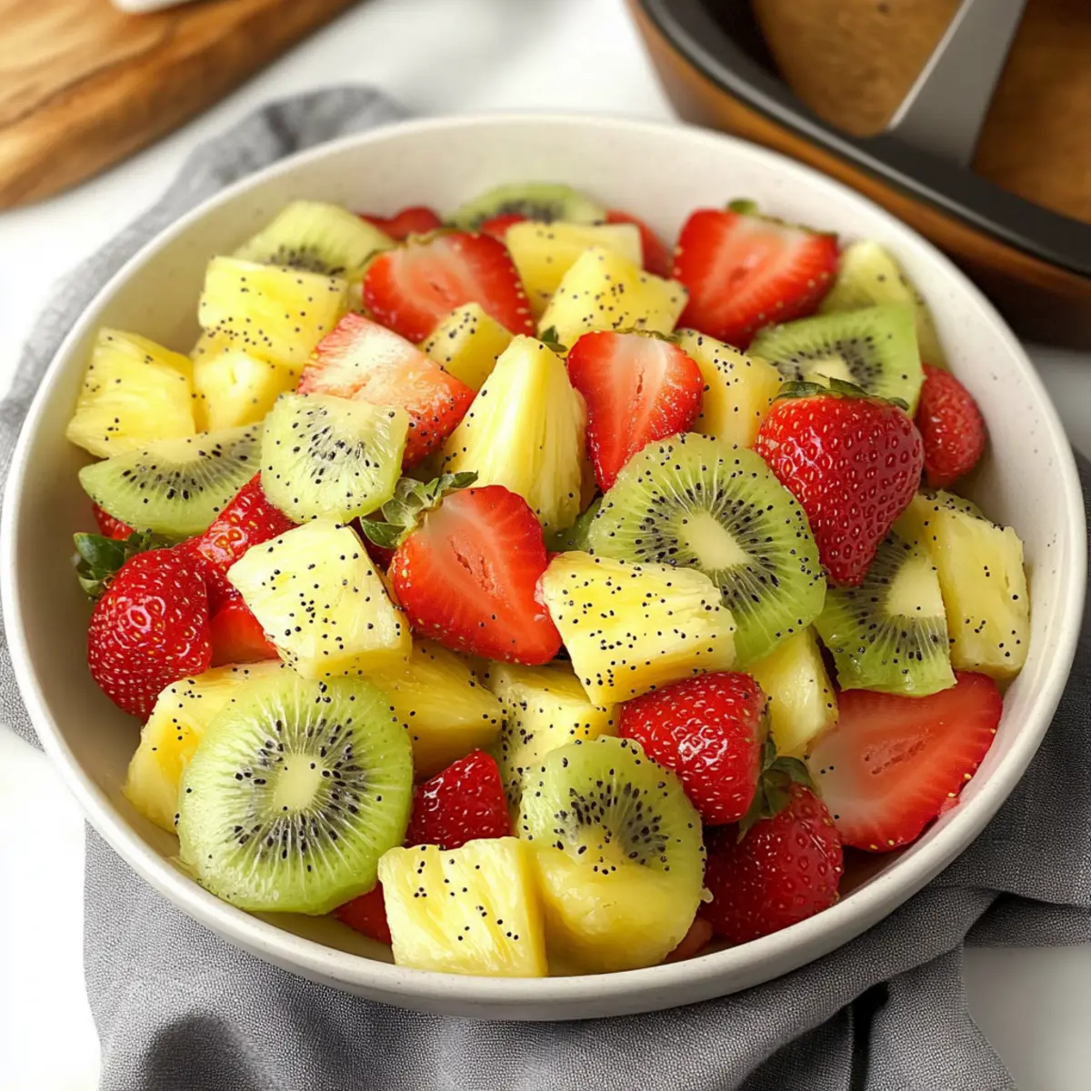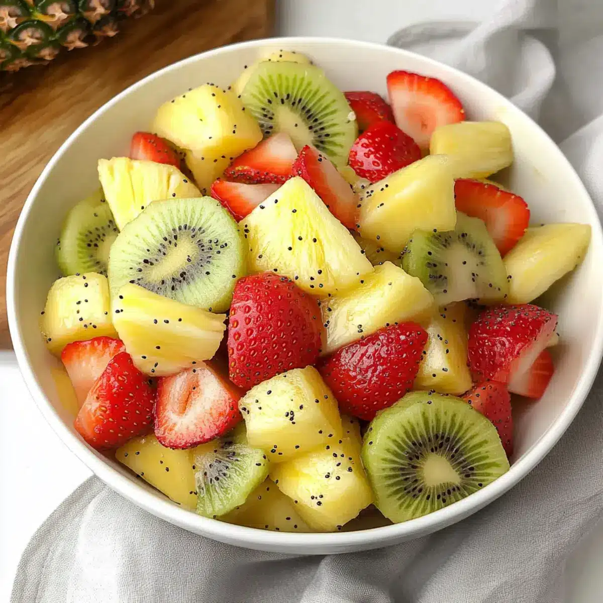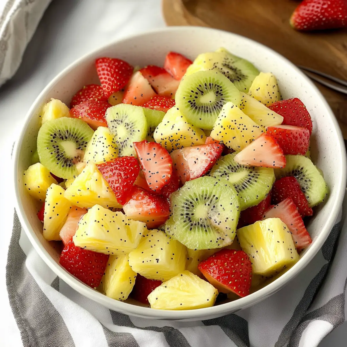 Next, take 16 ounces of ripe strawberries and remove their green tops, then slice them into quarters for easy eating. Peel and slice 4 kiwis into half-moons, giving your salad a vivid color contrast. Finally, core and cube one fresh pineapple, ensuring to look for firm texture. Add all the fruits to the bowl with your poppy seed dressing.