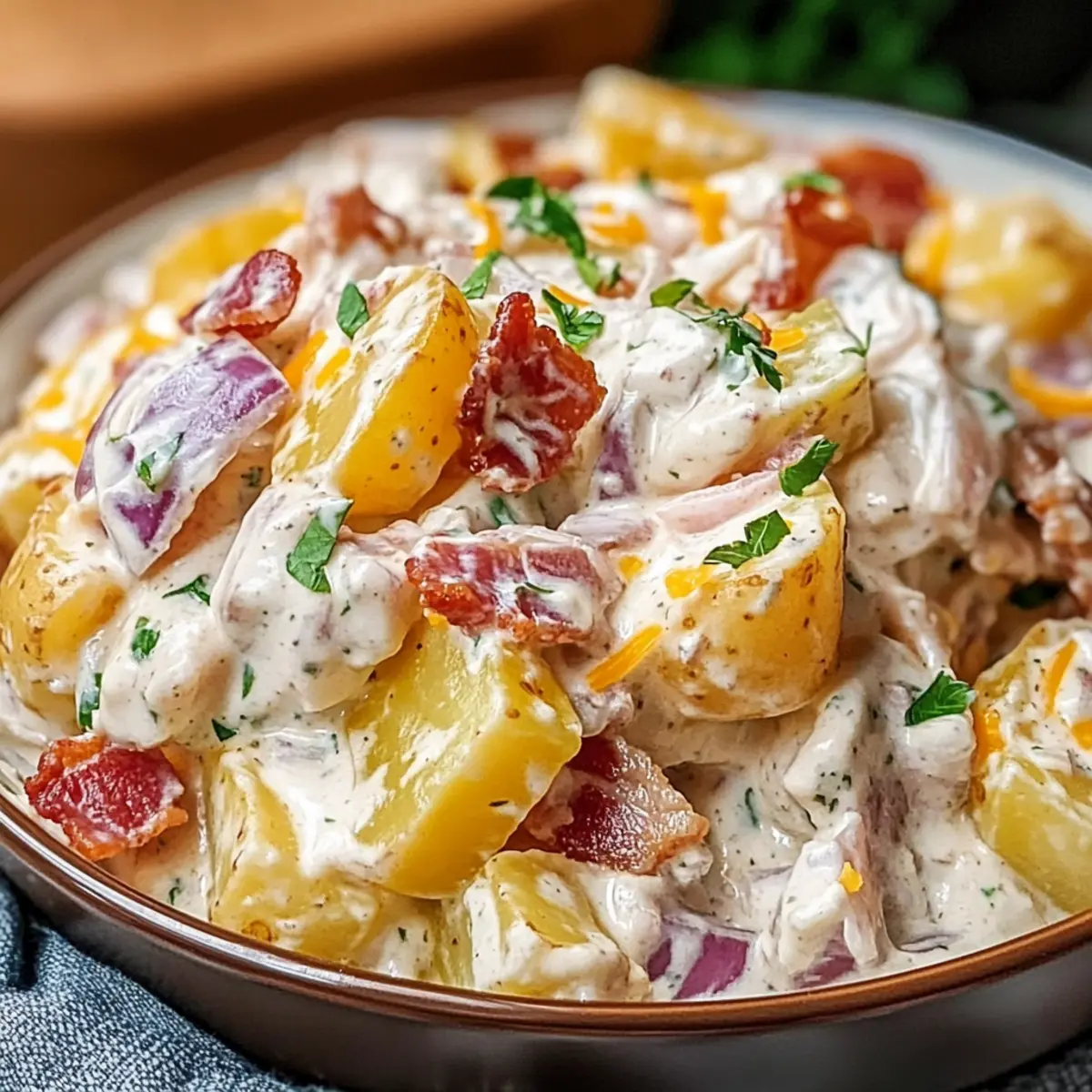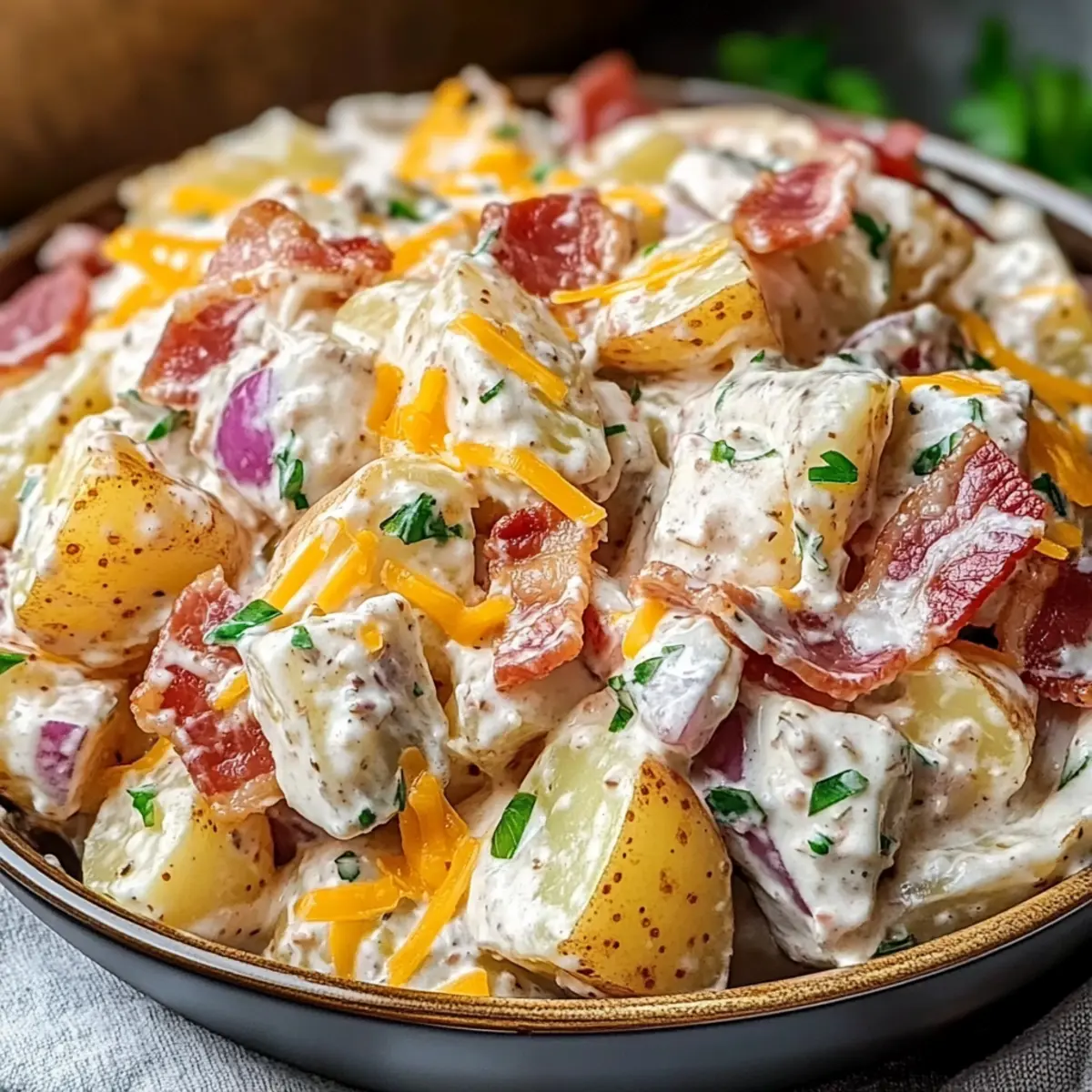 Freezer: Freezing is not recommended for this creamy salad, as the texture of the potatoes and dressing may change upon thawing.