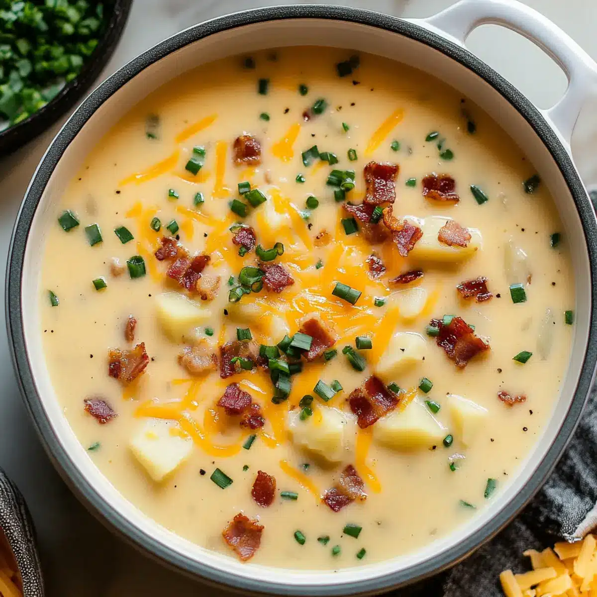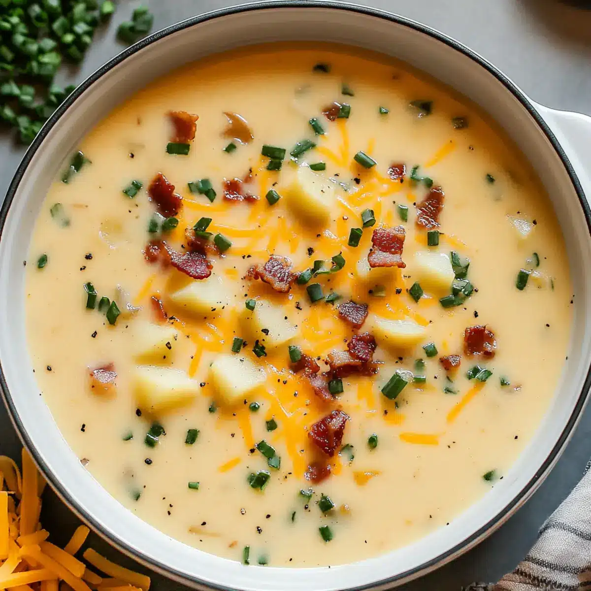 - Ladle soup into bowls and top with shredded cheddar cheese, crumbled bacon, and green onions. Serve immediately.