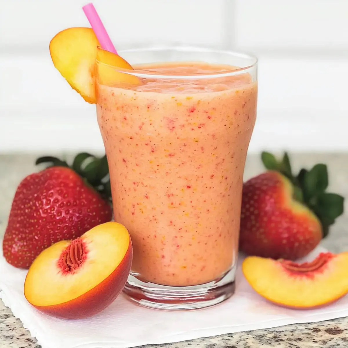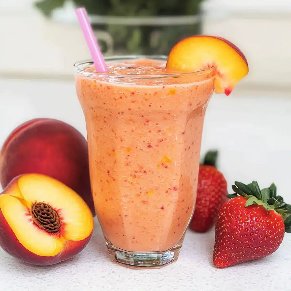 - Pour the smoothie into tall glasses and garnish with a slice of peach or a whole strawberry. Serve immediately.
