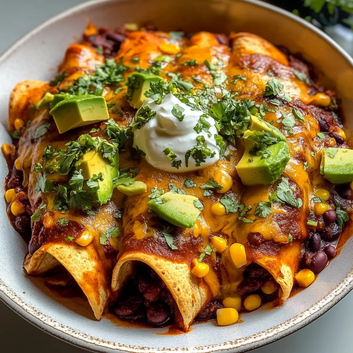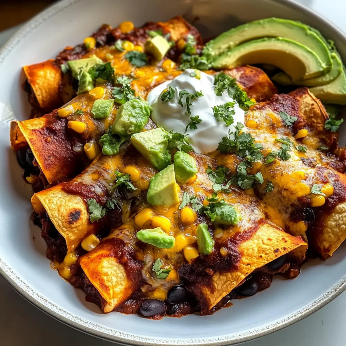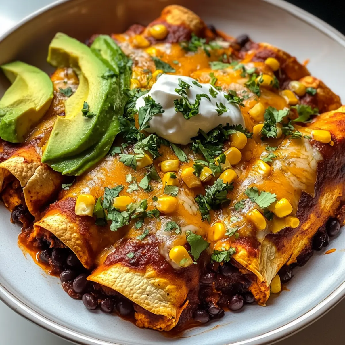 Once baked, remove the enchiladas from the oven and let them sit for a few minutes. This resting time allows the flavors to meld beautifully. Serve hot, garnished with sliced avocado and a dollop of sour cream on the side, adding the perfect creamy contrast to your vibrant Sweet Potato, Corn, and Black Bean Enchiladas.