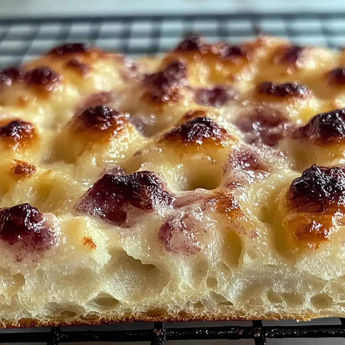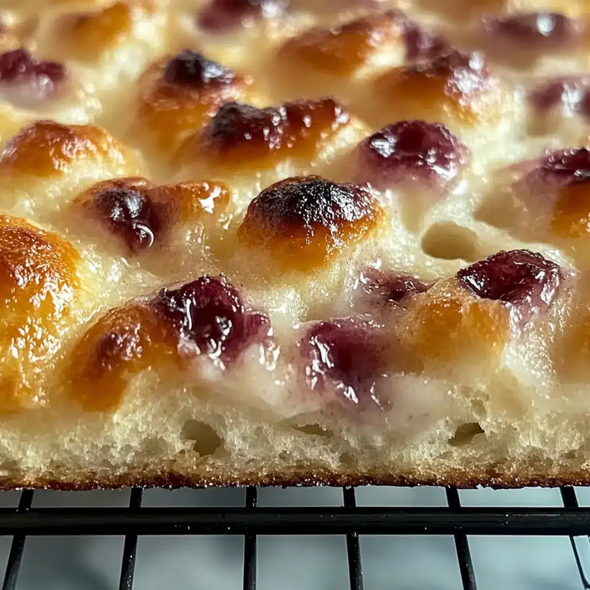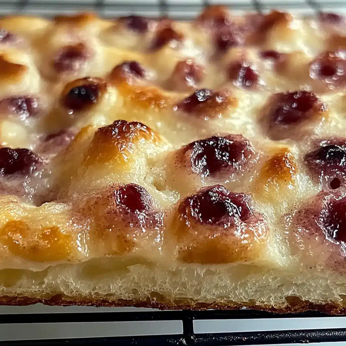 Fresh Berries: A medley of juicy raspberries and blueberries adds a vibrant, tangy balance to the sweetness of the focaccia, making every bite refreshing.