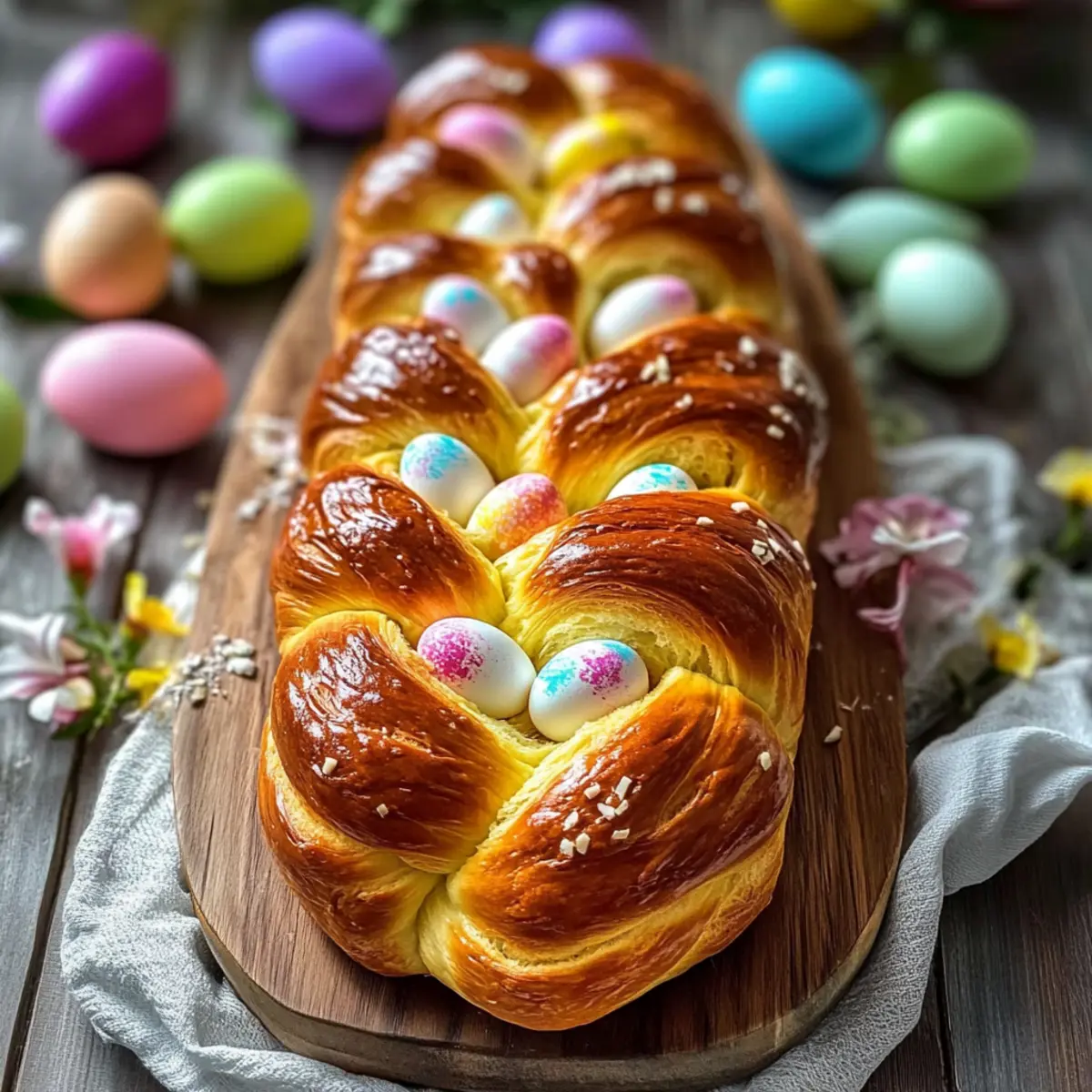 - Place the braided bread on a lined baking sheet. Gently press dyed hard-boiled eggs into the braid at even intervals.